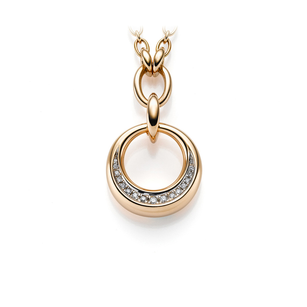 Klassischer Halsschmuck mit fein weißen Diamanten im runden Brillantschliff. Ein stilvoller, ringförmiger Anhänger, gearbeitet aus warmem Roségold 750/-, verhilft den halbmondförmig angeordneten, fein weißen Edelsteinen zu edlem Glanz. Preis inklusive massiv und hochwertig verarbeiteter Gliederkette aus 18 Karat Roségold.