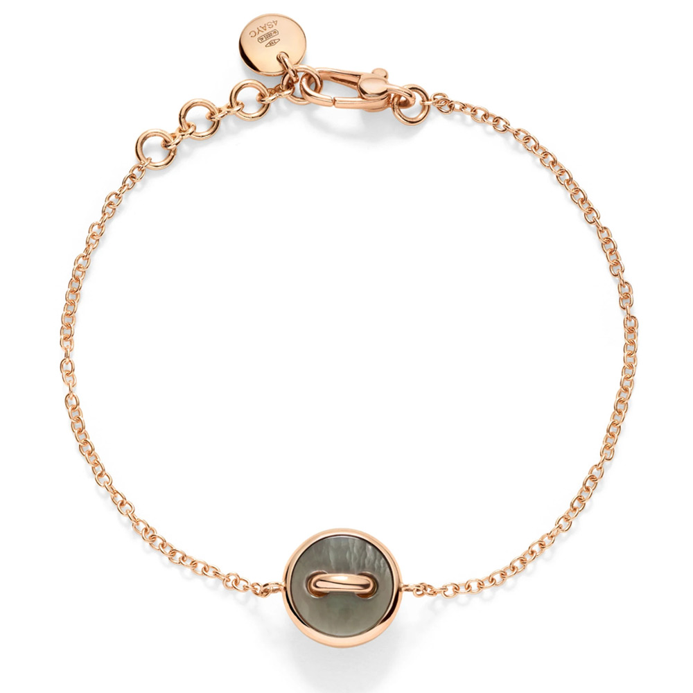 Die drehbaren Scheiben verleihen dem Schmuck eine überraschend vielseitige Note – ein Design, das sich spontan verwandeln lässt. Das Armband aus 18-karätigem Roségold zeigt auf der einen Seite zartes weißes Perlmutt, auf der anderen elegantes graues Perlmutt. Zwei Nuancen, ein Schmuckstück – für Looks voller Raffinesse.
