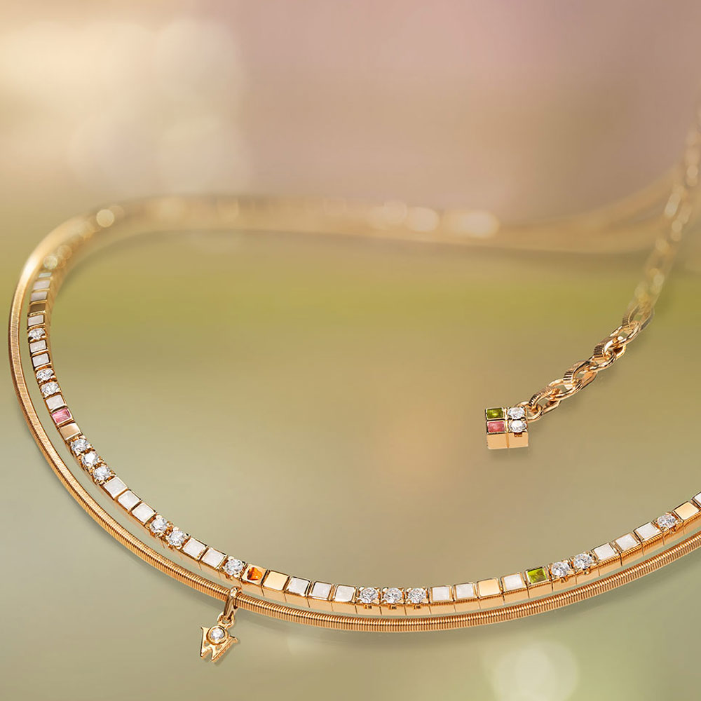 Das strahlendes Collier POWER IN WHITE aus 18-karätigem Gelbgold erinnert daran, die eigene Energie bewusst wahrzunehmen. Sanft bombierte Würfel in hellen Farben entfalten durch ihren feinen Linseneffekt eine besondere Tiefe und ein faszinierendes Schimmern. Diamanten im Brillant-Schliff setzen dazwischen elegante Akzente und verleihen dem Schmuckstück jene stille Kraft, die jeden Tag begleitet.