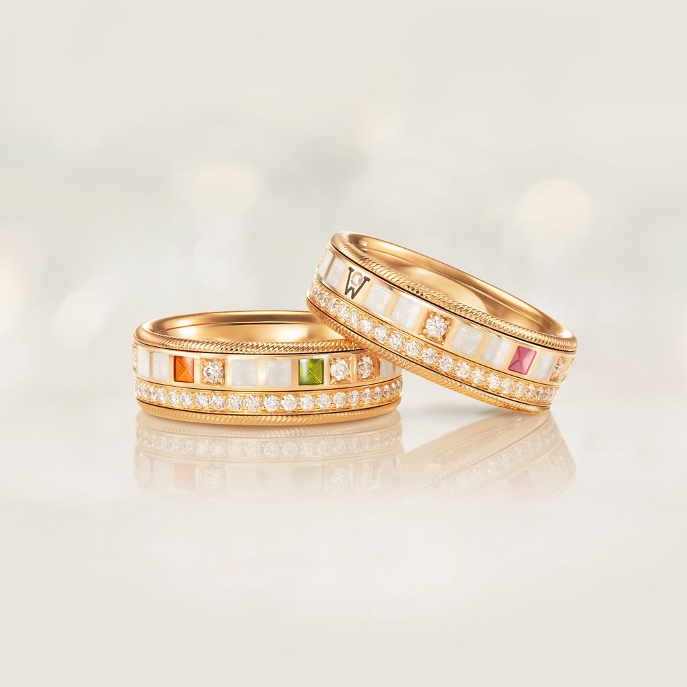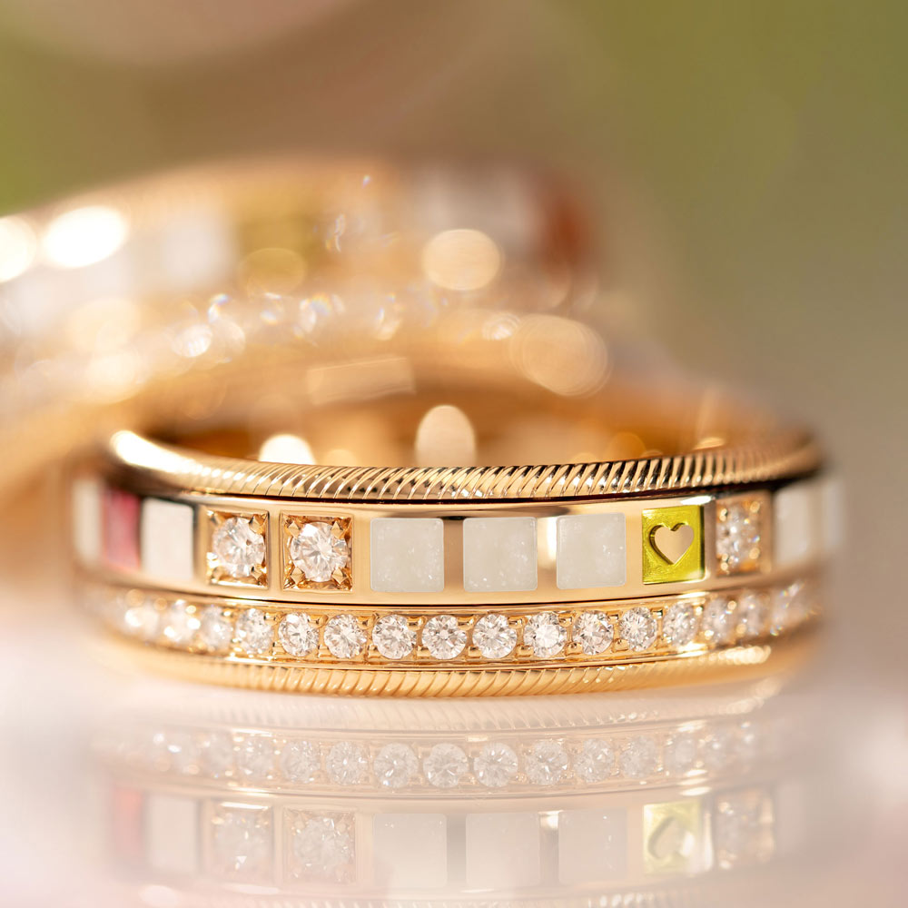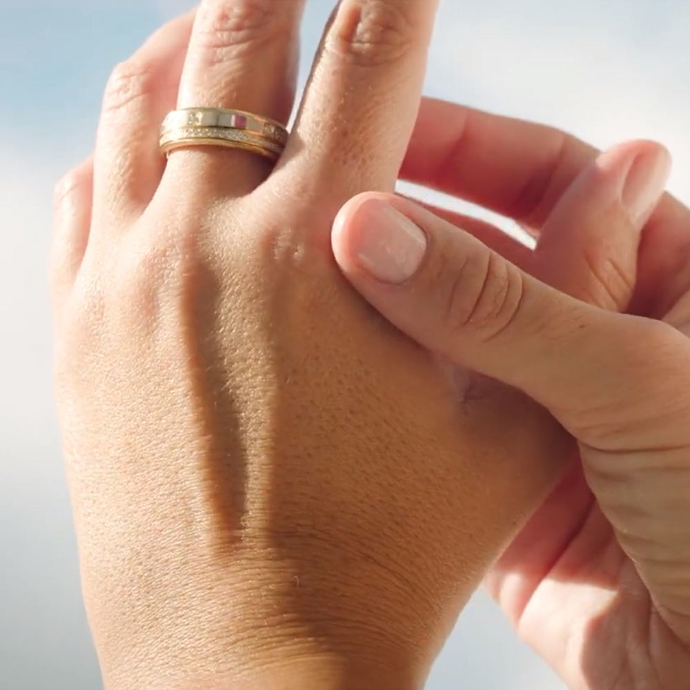 Jeden Tag bewegen wir uns in unterschiedlichen Rollen: im Beruf, in der Familie und in dem, was wir lieben. Um all das zu leben, braucht es Energie. Und Energie braucht eine Quelle, aus der sie entsteht. Der neue Ring POWER IN WHITE ist einer von vier Power-Ringen. Er ist ein Begleiter, der Kraft verleiht, Energie schenkt und an die eigene Stärke erinnert. Er symbolisiert eine persönliche Superpower, die jeden Tag neu gewählt werden kann. Leicht, jung und frisch trägt er sich wie selbstverständlich. Beim Drehen entfaltet sich die ganze Freude an Farben und das Tragen wird zu einem besonderen Erlebnis. Perlmuttweiße Kaltemaille, von Hand in feinen Schichten aufgetragen, schenkt dem Ring eine sinnliche Ruhe und ein lebendiges Funkeln: Winzige Kristalle reflektieren das Licht wie Sternenstaub und lassen ihn bei jeder Bewegung erstrahlen. Dreidimensionale Gravuren mit zahlreichen Ebenen verwandeln das Licht in strahlende „Sonnenlicht-Spiegel“, die aus jedem Winkel leuchten. Vollendet wird das Design durch kunstvoll gefasste Brillanten, deren präzise gesetzte Goldfacetten und funkelnde Details die Leuchtkraft der Farben noch intensivieren.