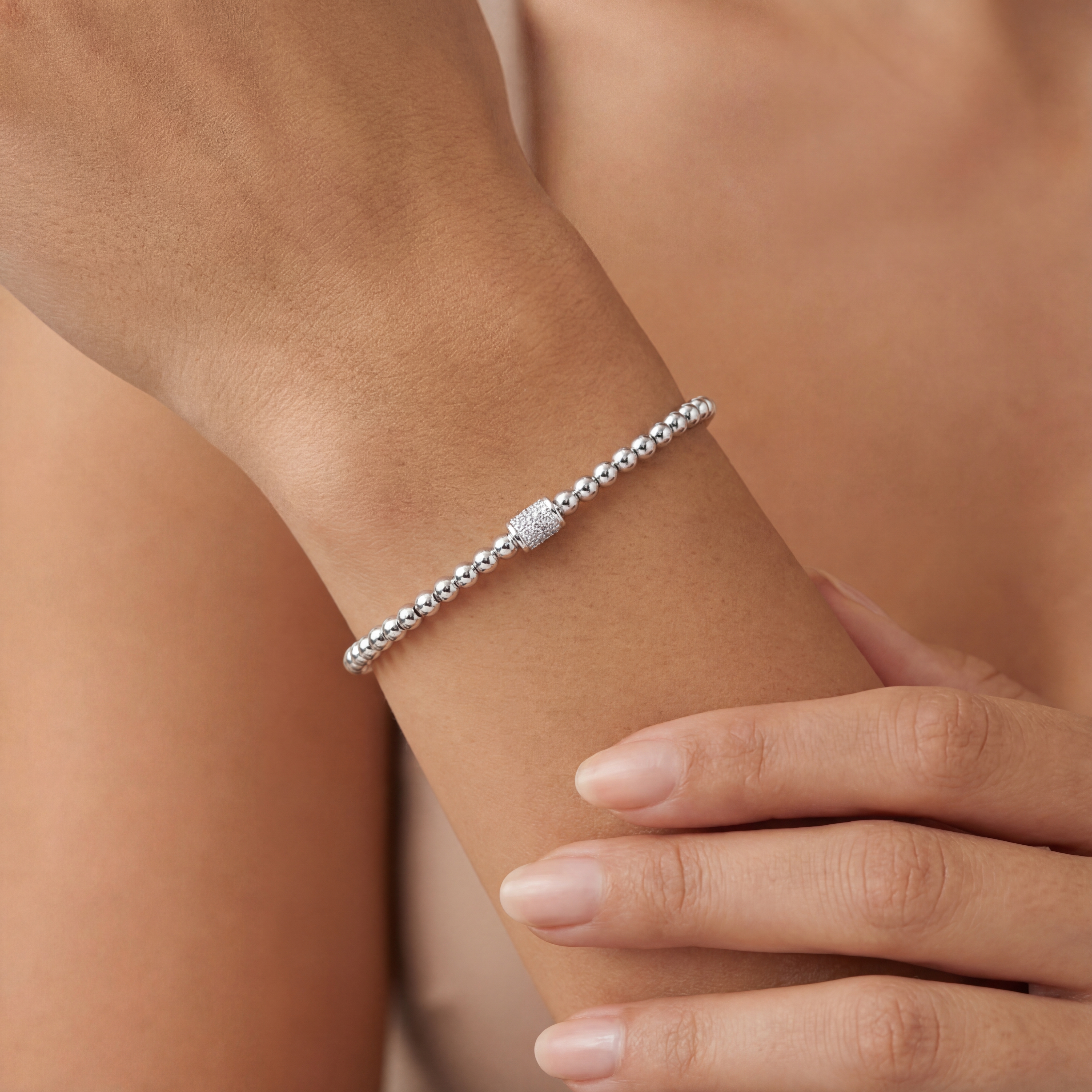 Casual und lässig im Stil, hochwertig verarbeitet: stretchbares, verschlussloses Armband aus Weißgold 750/- mit einer aus Diamanten pavée ausgefassten Ronde. Durch seine Stretchbarkeit ist es spielend leicht an- und ausgezogen. Wunderbar casual und alltagstauglich!