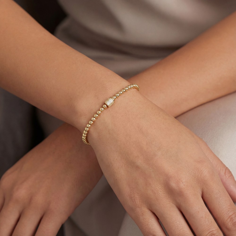 Casual und lässig im Stil, hochwertig verarbeitet: stretchbares, verschlussloses Armband aus Gelbgold 750/- mit einer aus Diamanten pavée ausgefassten Ronde. Durch seine Stretchbarkeit ist es spielend leicht an- und ausgezogen. Wunderbar casual und alltagstauglich!