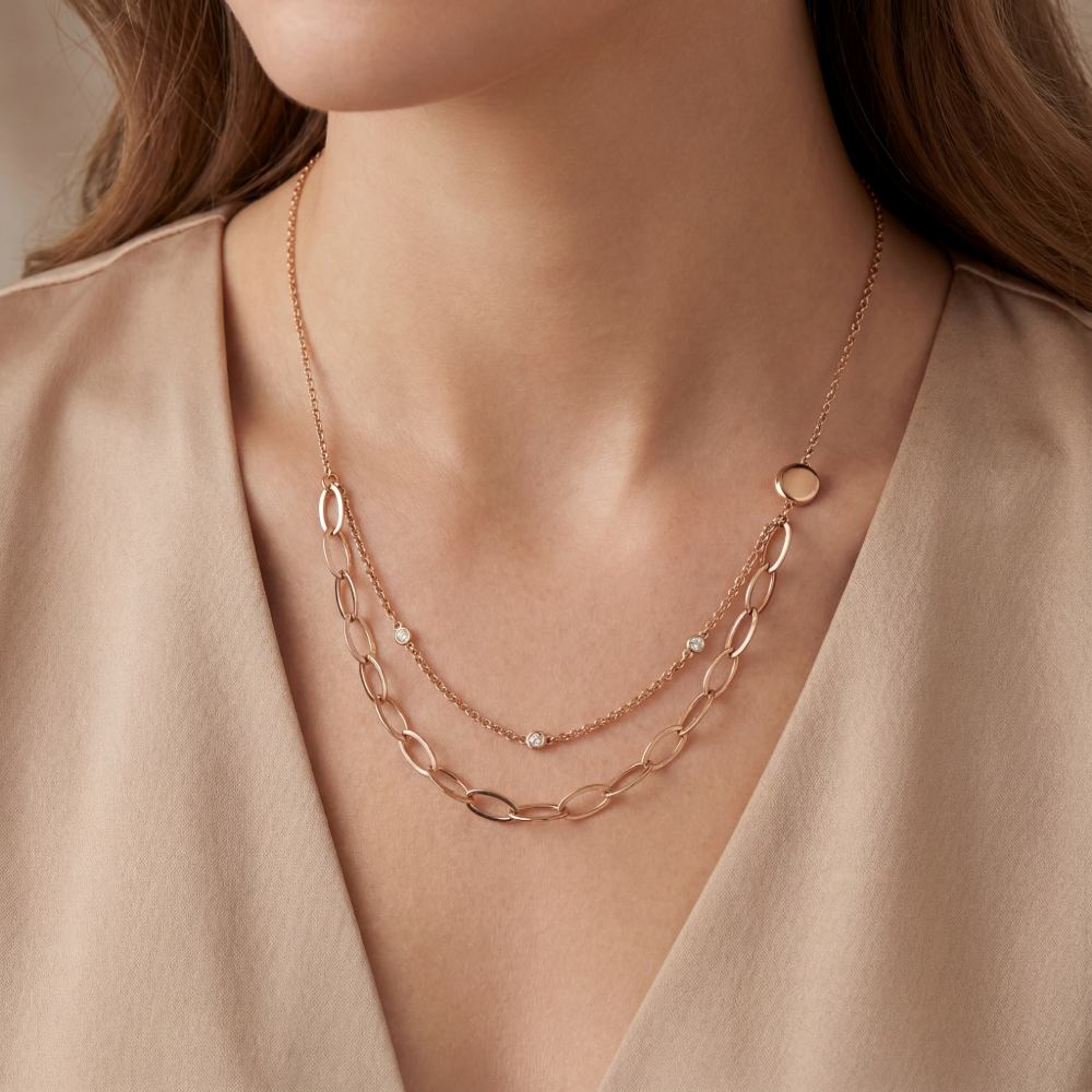 Sportive zweireihige Collierkette mit zeitloser Eleganz.  Gefertigt aus hochwertigem Roségold 750/-, veredelt mit Diamanten im Brillantschliff.