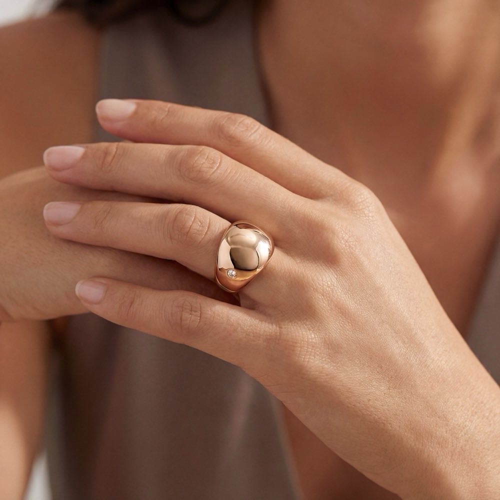 Stilvoller Ring mit zwei fein weißen Diamanten im runden Brillantschliff, handgearbeitet aus warmem Roségold 750-.