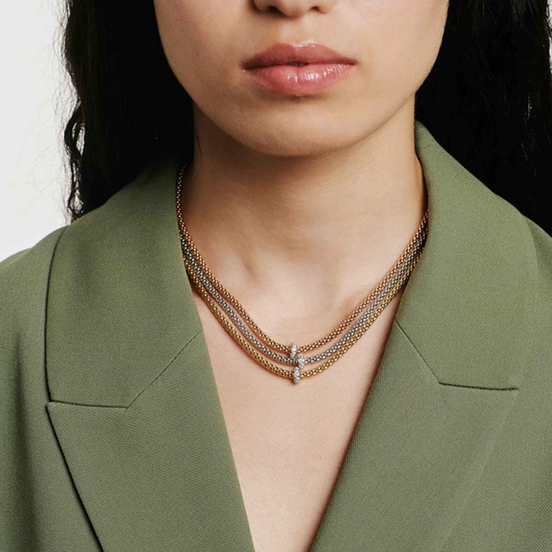Die Prima-Kollektion von FOPE besticht durch ihre schlanke, leichte und flexible Struktur, die den charakteristischen Stil der Marke verkörpert. Das Gewebe besteht aus winzigen Federn aus 18-Karat-Gold, was den Armbändern und Ringen eine sanfte Flexibilität verleiht. Ergänzt wird die Kollektion durch elegante Ohrringe und Ketten in verschiedenen Ausführungen. Das weiche, goldene Novecento-Geflecht präsentiert sich in entspannter Form und bietet zahlreiche Kombinationsmöglichkeiten. Die Schmuckstücke können sowohl einzeln getragen als auch perfekt mit anderen FOPE-Kollektionen kombiniert werden.