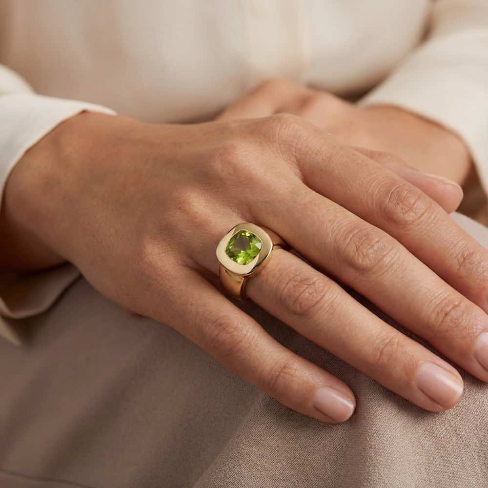 Eindrucksvoller und moderner Cocktail-Ring mit einem lindgrünen Peridot im Cushion-Cut. In feiner Handarbeit aus edlem Gelbgold 750/- gearbeitet.