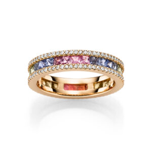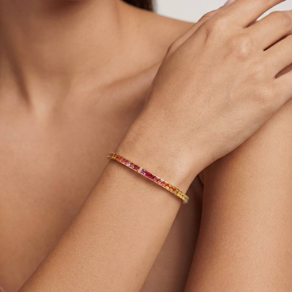 Farbenfroher Armschmuck mit verschiedenfarbigen Saphiren in einem eindrucksvollen Farbverlauf. In meisterlicher Handarbeit aus edlem Roségold 750/- gefertigt.