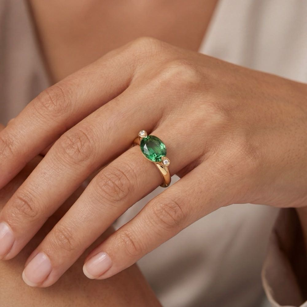 Außergewöhnlich schicker Ring mit einem leuchtend grünen Turmalin im Ovalschliff und zwei fein weißen Diamanten im runden Brillantschliff. Als strahlender Mittelpunkt wirkt der von zwei tropfenförmig gefassten Brillanten verzierte Farbedelstein in einer handgefertigten Ringschiene aus edlem Gelbgold 750/-.