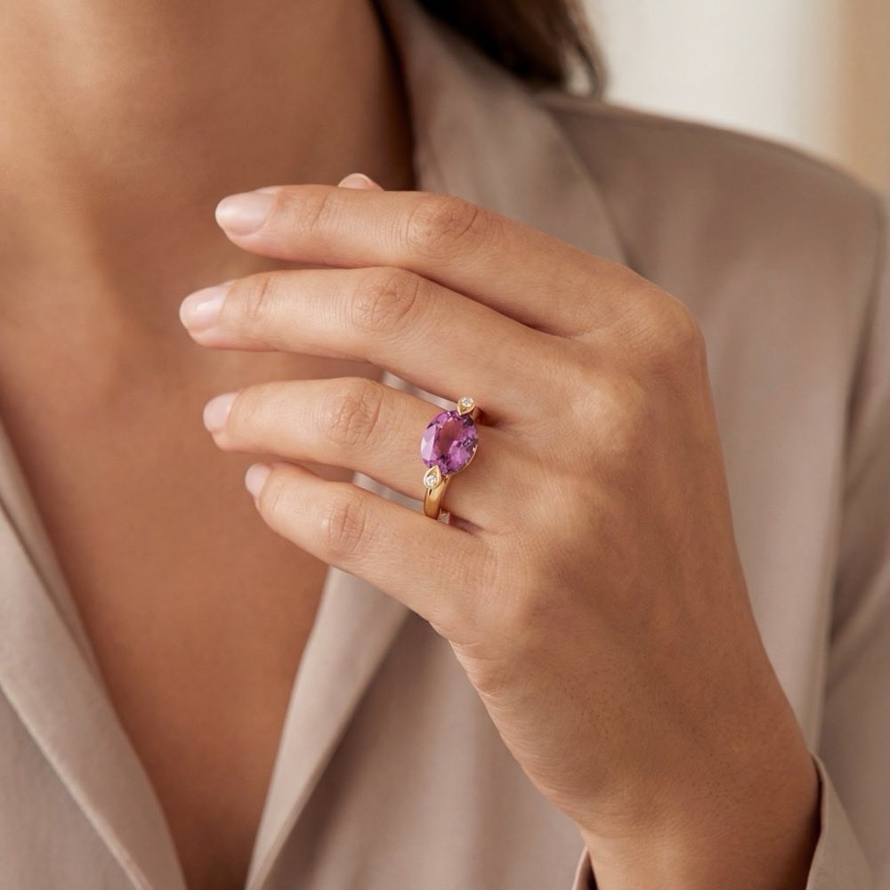 Entzückender Ring mit einem leuchtenden, violett strahlenden Amethyst im Oval-Schliff und zwei fein weißen Diamanten im runden Brillantschliff. Das warme Roségold 750/- des handgefertigten Ringes harmonisiert hervorragend mit dem wunderbar violetten Leuchten des feinen Edelsteines. Zwei tropfenförmig gefasste Brillanten betonen zudem das Funkeln des glänzenden Amethystes.