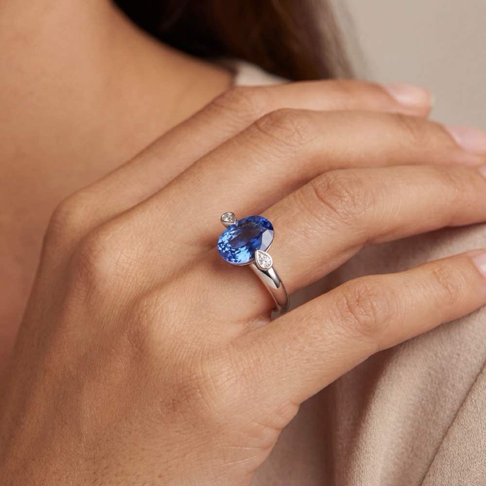 Schön schlicht und bezaubernd schön: Das ist Raindrops. Ein leuchtender Farbedelstein im Zentrum und zwei seitliche, tropfenförmige Einfassungen bilden ein magisches Trio. Die Farbe und das Funkeln des Edelsteins kommen durch seinen Oval-Schliff besonders schön zur Geltung.