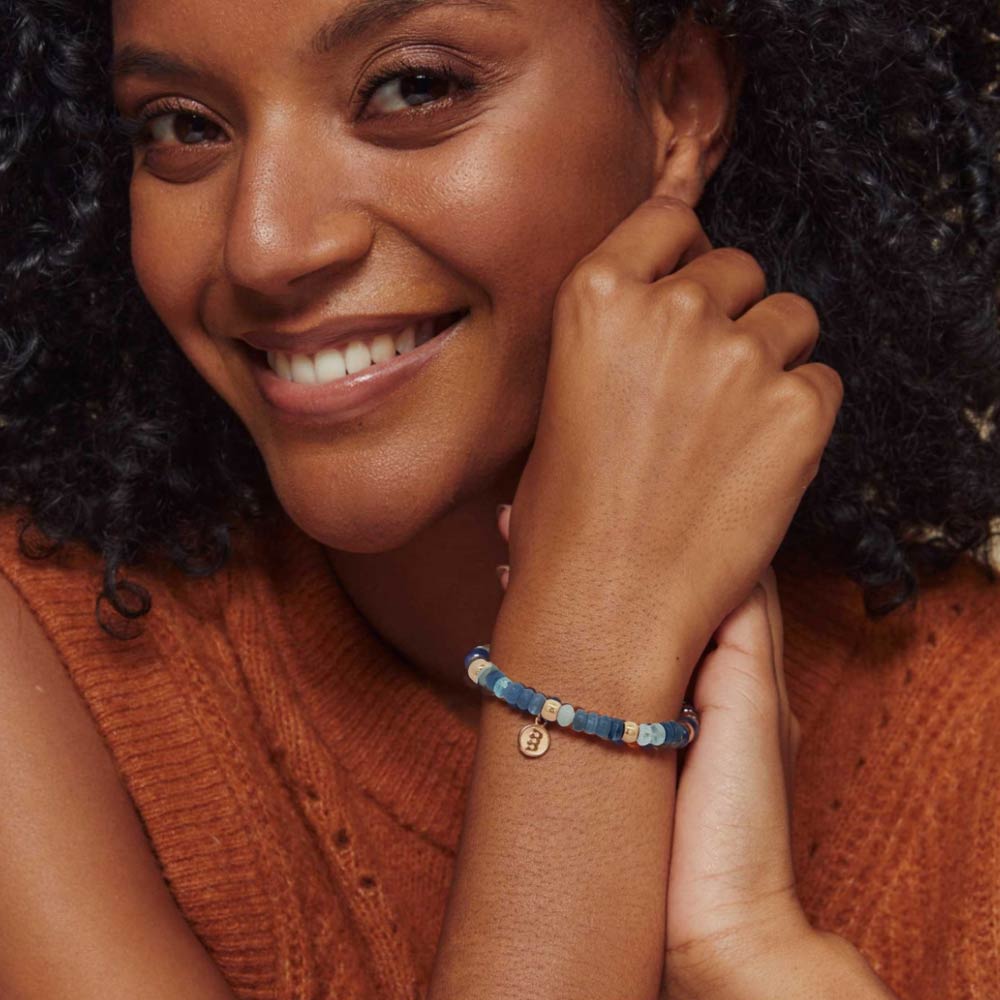 Reflex Armband aus 18‑karätigem Roségold mit Aquamarin und Kyanit in verschiedenen Blautönen. Ein farbenfroher, moderner Look mit sieben goldenen Elementen und Bron‑Tag – ein vielseitiger Begleiter, der sowohl solo aus auch im Layer-Look perfekt zur Geltung kommt.
