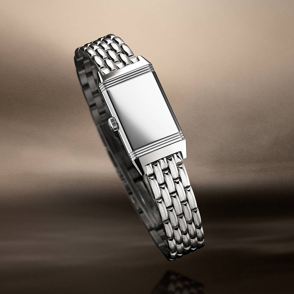 Die Reverso Classic Monoface Origin interpretiert das elegante Design der ersten Damenmodelle aus den 1930er-Jahren neu. Gebläute Dauphine-Zeiger heben sich stilvoll vom dezenten, monochromen Zifferblatt ab. Dieses ist mit doppelter Guillochierung und vertikal gebürsteter Oberfläche veredelt und vereint die typischen Art-Déco-Elemente der Reverso: markante Godrons auf beiden Seiten des Edelstahlgehäuses, ein zentraler Minutenring sowie arabische Ziffern. Die Rückseite des Gehäuses bietet Raum für persönliche Gravuren oder Lackierungen. Ein feingliedriges Edelstahlarmband rundet den zeitlosen Charakter dieser Uhr perfekt ab.