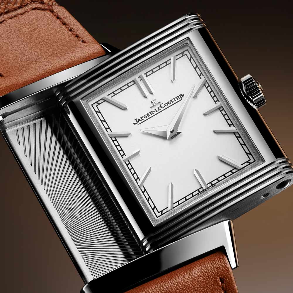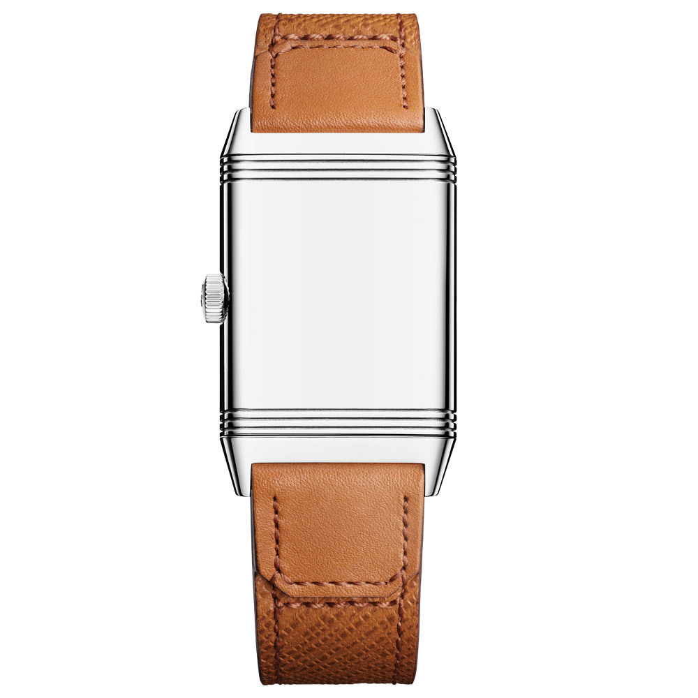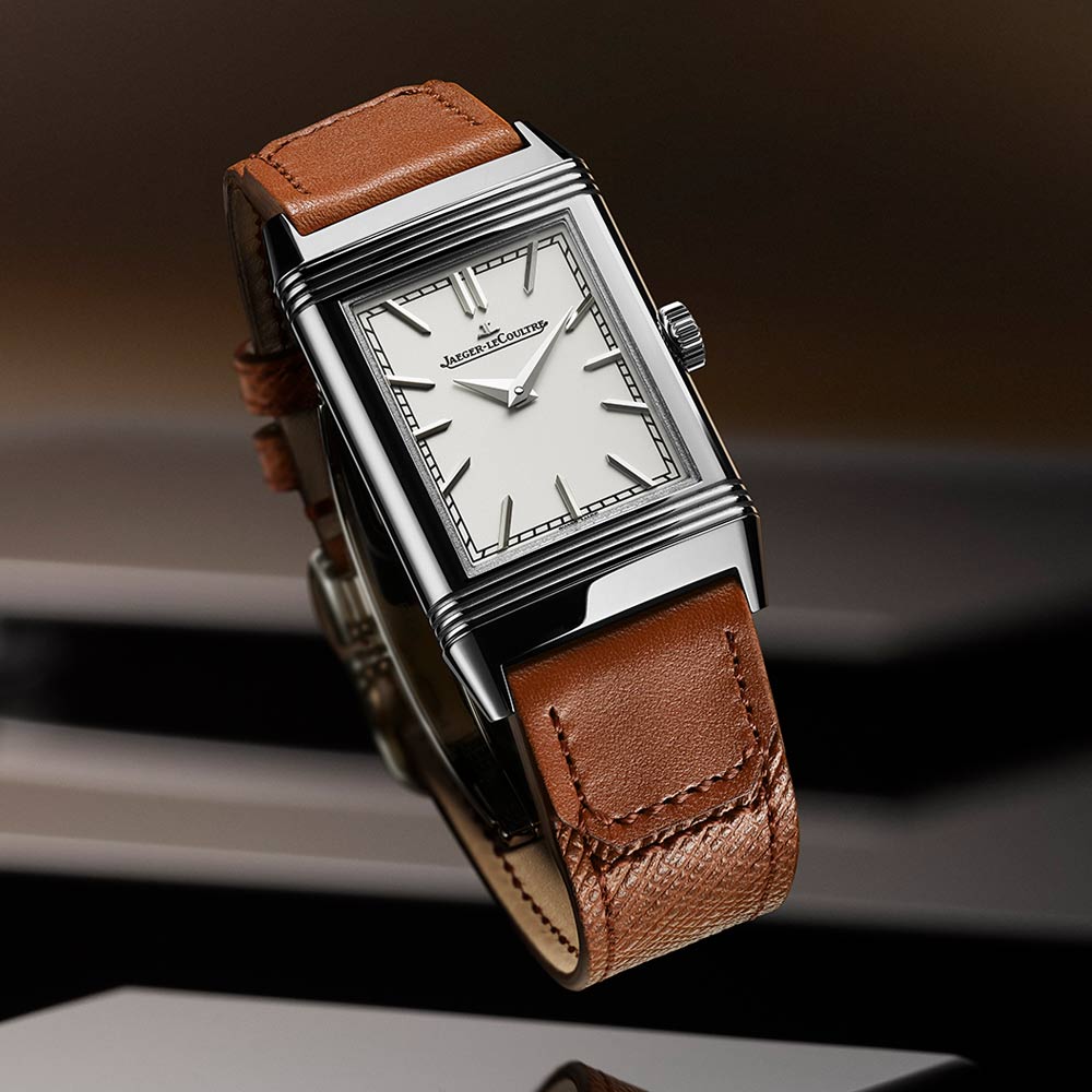 Ikonische Reverso Tribute Monoface mit silbergrauem Zifferblatt mit Opalin-Veredelung, mechanischem Handaufzugswerk und Jaeger-LeCoultre Kaliber 822. Austauschbares Armband mit Faltschließe im typischen Fagliano-Design: Kombination aus glattem Kalbsleder und genarbtem Kalbsleder im Saffiano-Stil. Ein zeitloses Modell, das perfekt am Handgelenk sitzt.