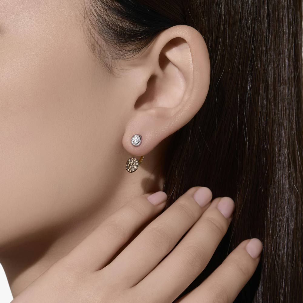 Zeitloser Ohrschmuck mit braunen Diamanten im Pavée-Setting und mit einem weißen Solitär-Diamanten in Kombination . Sabbia zelebriert die unregelmäßige Schönheit der Natur und bietet verschiedene Möglichkeiten, Diamanten auf eine neue Art und Weise zu tragen. Gefertigt aus 18 Karat Roségold.