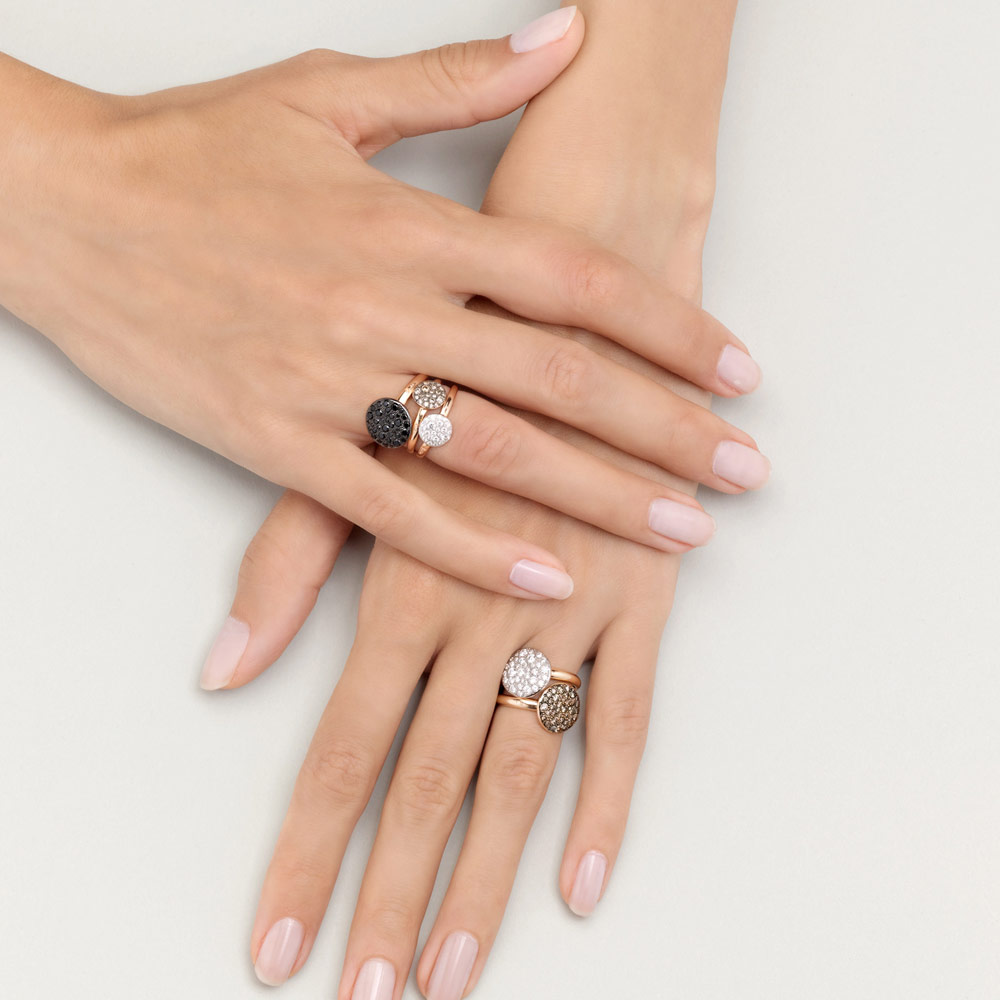 Die Kollektion Sabbia – zu deutsch „Sand“ – ist eine Hommage an die glitzerndem Strände und Oasen dieser Welt. Diamanten, in einem dichten Pavée gefasst, glitzern wie feinkristalliner Sand im Sonnenschein. Wie schimmernde Inseln mit natürlichen Konturen liegen schwarze, braune und weiße Diamanten in einem zarten Mix charmant nebeneinander.