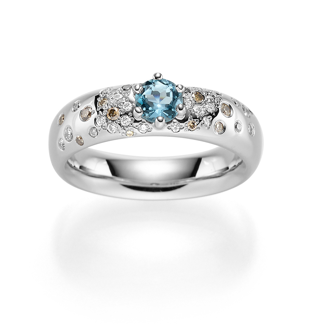 Bezaubernder, sportlicher Ring mit einem leuchtend blauen Topas und fein weißen sowie braunen Diamanten im runden Brillantschliff. Zart und ungleichmäßig eingefasst in die handgefertigte Ringschiene aus hochwertigem Weißgold 750/- bilden die strahlenden Brillanten einen wundervollen Kontrast zu dem im Mittelpunkt wirkenden leuchtenden Blautopas.