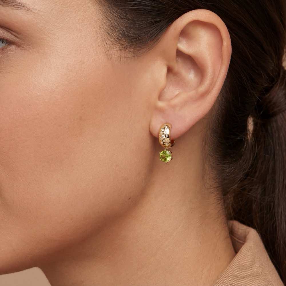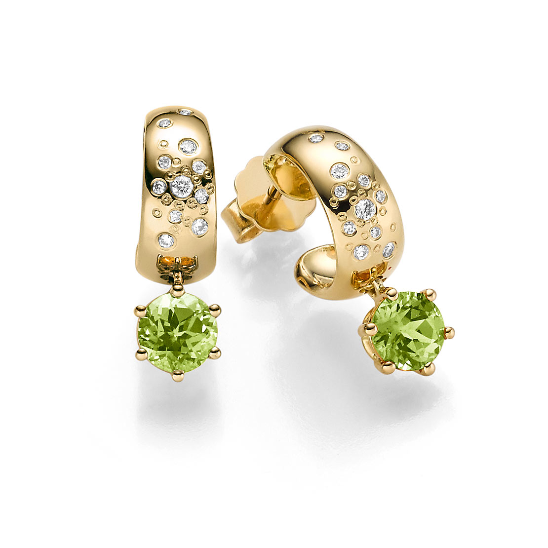 Attraktiver Ohrschmuck mit zwei leuchtend grünen Peridots und fein weißen Diamanten im runden Brillantschliff. Zart und ungleichmäßig in der Anordnung sind die strahlenden Brillanten gefasst in einem schlichten Ohrring, handgearbeitet aus edlem Gelbgold 750/-. Ein wunderbarer Kontrast und eine sportlich unkomplizierte Ausstrahlung entsteht durch den farbenfrohen grünen Peridot, dezent gefasst als leuchtender Blickfang dieses Schmuckstücks.