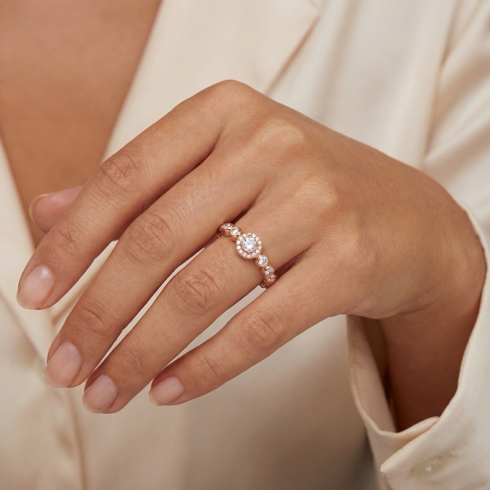 Attraktiver Ring mit fein weißen Diamanten im runden Brillantschliff. Eine faszinierende Ausstrahlung entsteht durch das lässige Design aneinander gereihter zarter Kugeln aus warmem Roségold 750/- in Kombination mit edel und weiß strahlenden Brillanten.