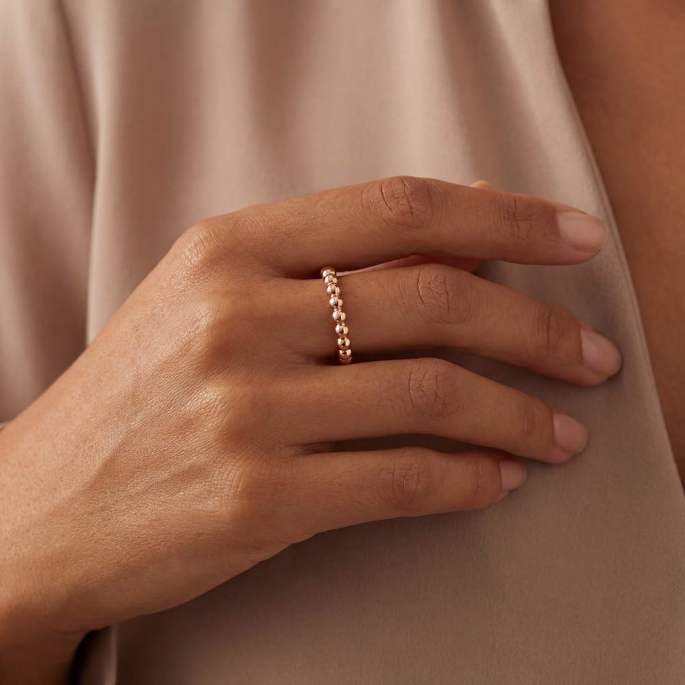 Schlichter und sportlicher Ring ganz in Weiß. Eine faszinierende Ausstrahlung entsteht durch das lässige Design aneinander gereihter zarter Kugeln aus warmem Roségold 750/-. Ein Ring zum Kombinieren oder alleine als feiner eye-catcher getragen.