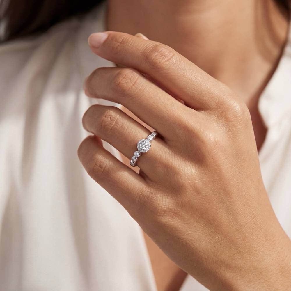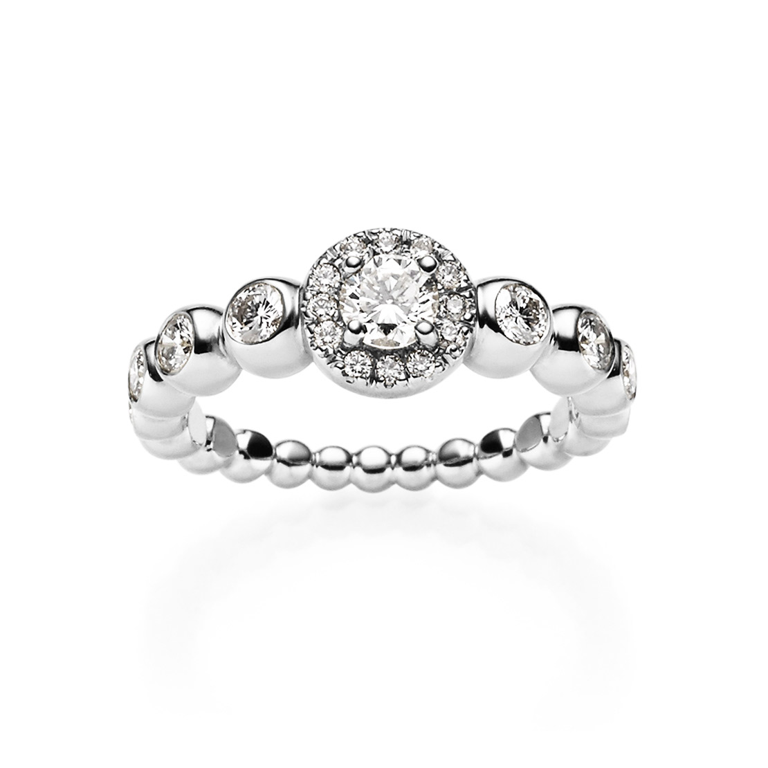 Attraktiver Ring mit fein weißen Diamanten im runden Brillantschliff. Eine faszinierende Ausstrahlung entsteht durch das lässige Design aneinander gereihter zarter Kugeln aus warmem Weißgold 750/- in Kombination mit edel und weiß strahlenden Brillanten.