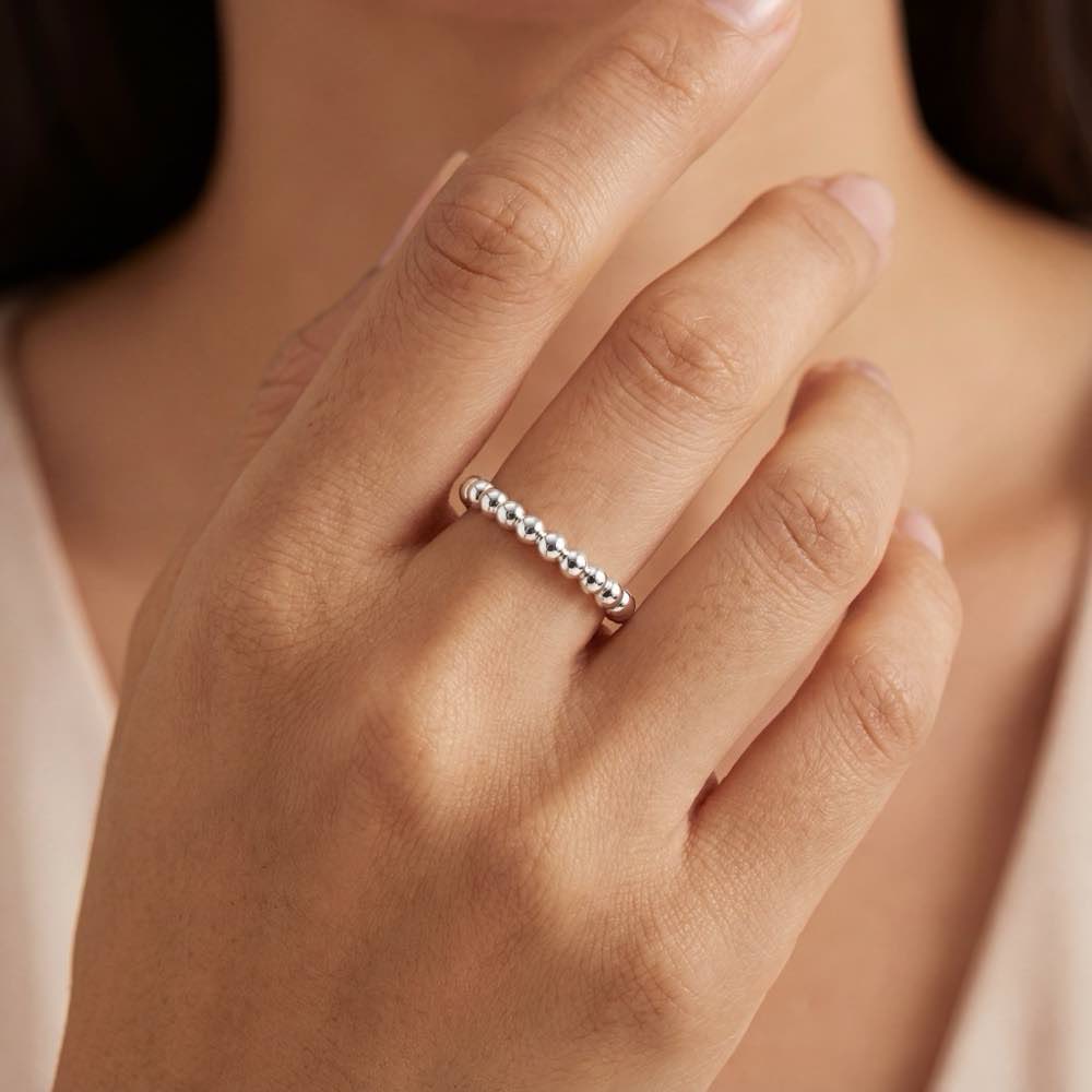 Schlichter und sportlicher Ring ganz in Weiß. Eine faszinierende Ausstrahlung entsteht durch das lässige Design aneinander gereihter zarter Kugeln aus edlem Weißgold 750/-. Ein Ring zum Kombinieren oder alleine als feiner eye-catcher getragen.