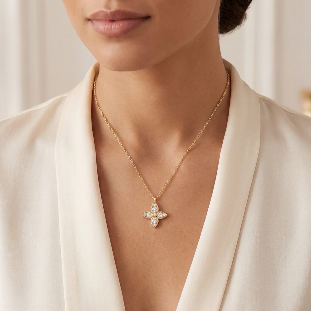 Bezaubernder Anhänger inklusive Collierkette aus einem funkelnden Sternmotiv, das mit leuchtend weißen Diamanten ausgefasst ist. In feiner Handarbeit aus Gelbgold 750/- gefertigt.