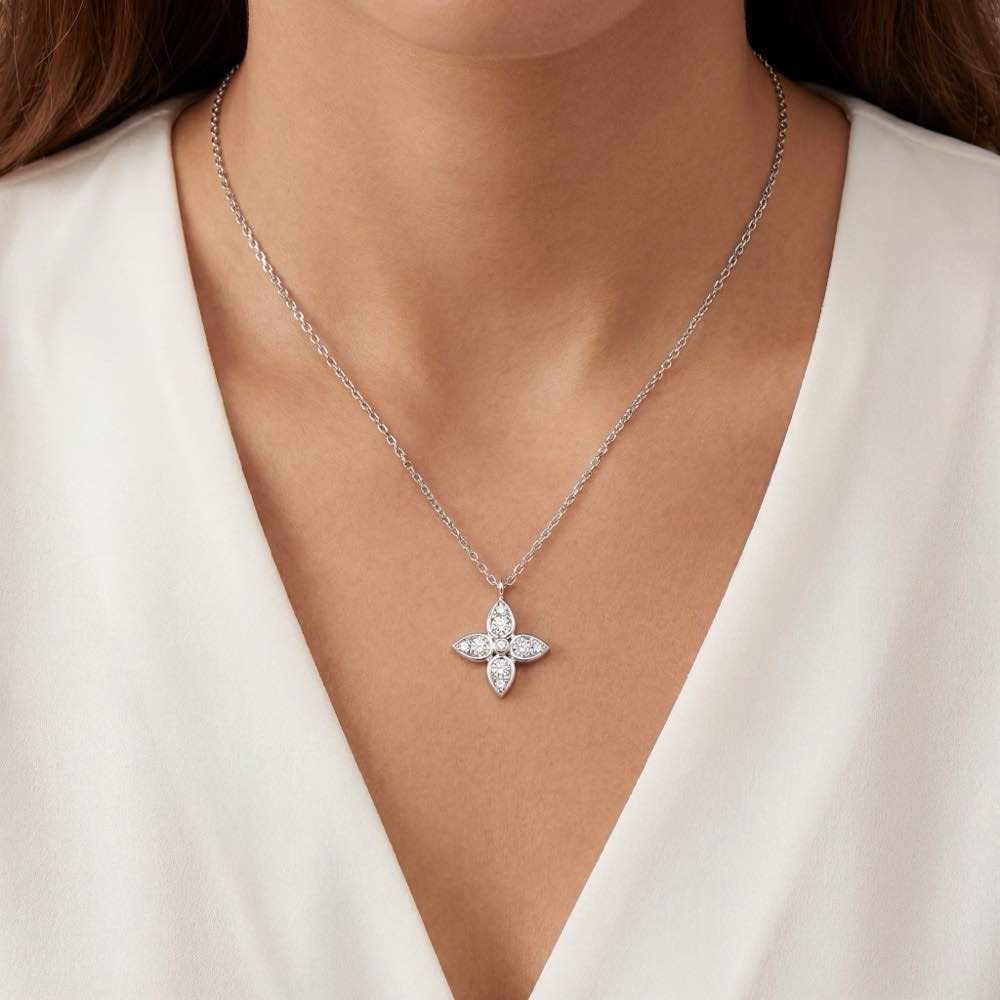 Bezaubernder Anhänger aus funkelnden Sternmotiven, die mit leuchtend weißen Diamanten ausgefasst sind. In feiner Handarbeit aus Weißgold 750/- gefertigt.