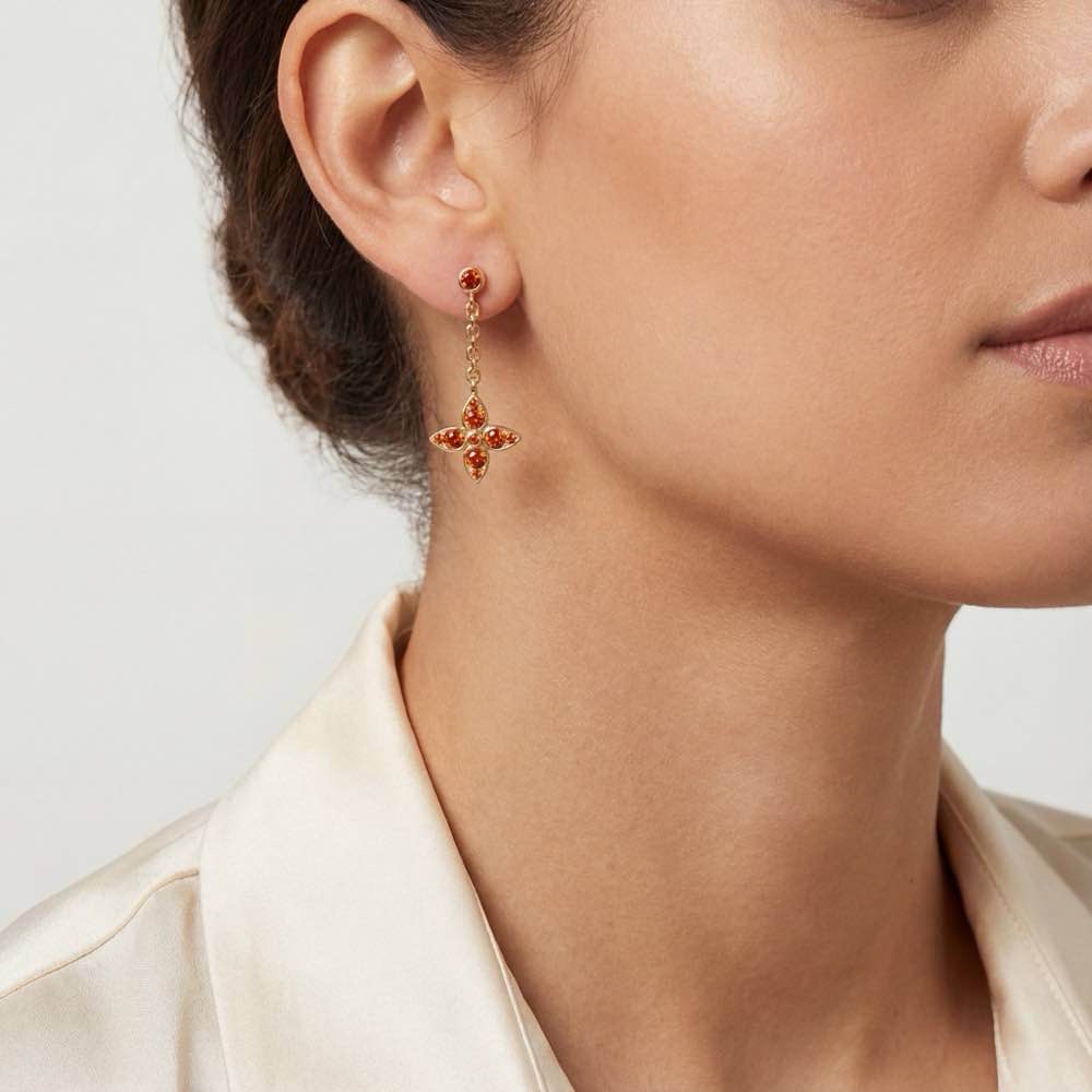 Frei bewegliche Ohrringe aus einer Vielzahl von funkelnden Sternmotiven, die mit leuchtend orangefarbenen Saphiren ausgefasst sind. In feiner Handarbeit aus Roségold 750/- gefertigt.