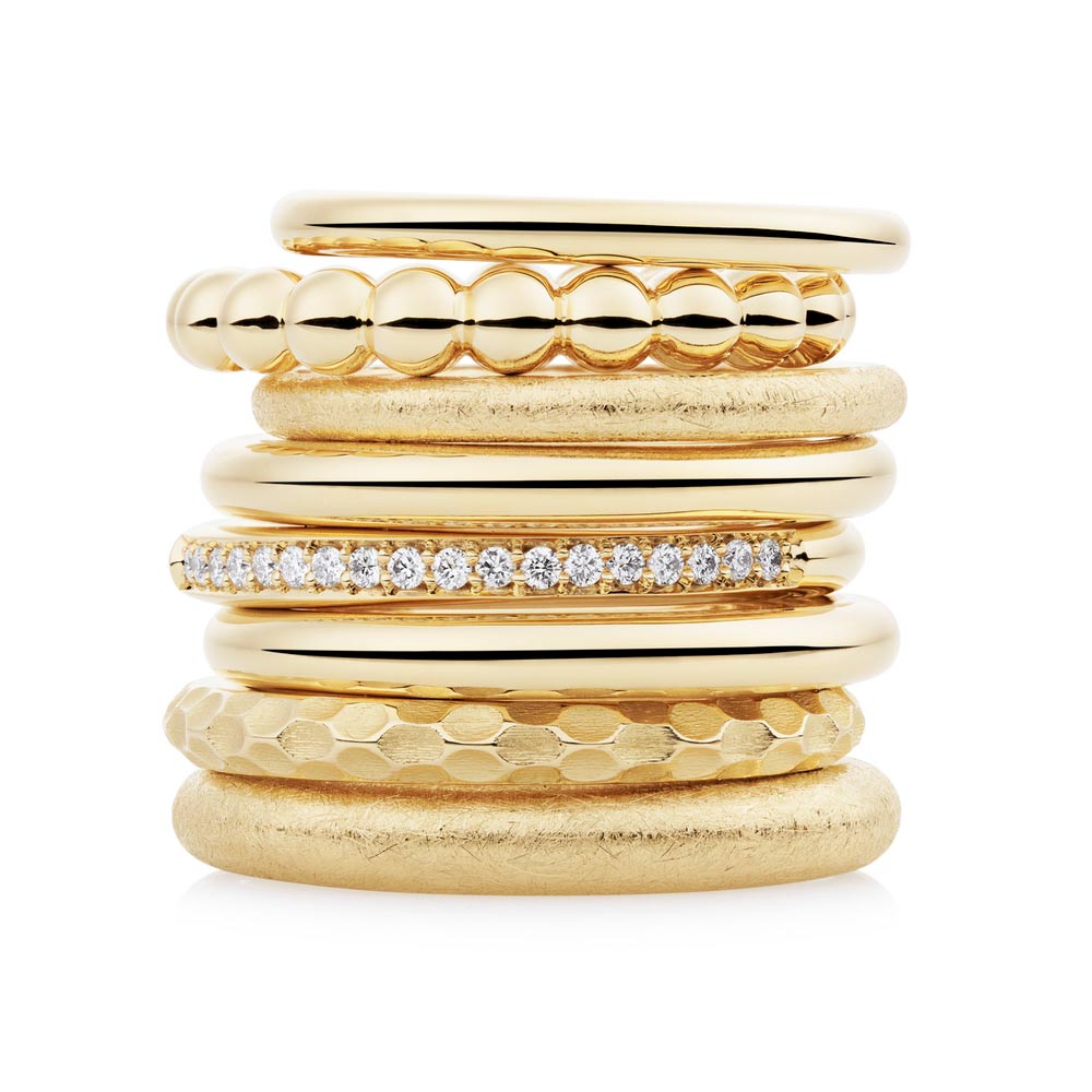 Stax-Ring mit weißen Diamanten aus 18-karätigem Gelbgold - der perfekte Ansteckring und eine ideale Ergänzung für jede anspruchsvolle Schmucksammlung.