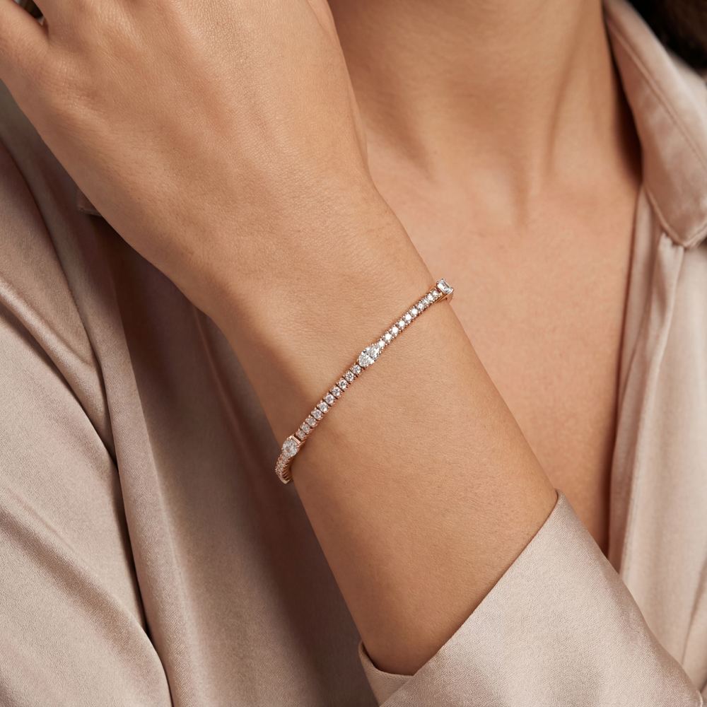 Elastisches Zugarmband ohne Verschluss mit fein weißen Diamanten in verschiedenen Schliffformen. Mit seiner exzellenten Verarbeitung und technisch ausgereift, ist es spielend leicht und sicher in der Handhabung. Aus edlem Roségold 750/- gefertigt.