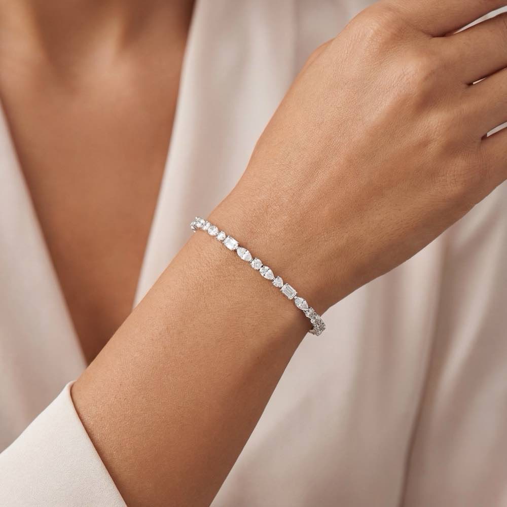 Exklusives und elastisches Zugarmband ohne Verschluss mit fein weißen Diamanten aus verschiedenen Schliffformen. Mit seiner exzellenten Verarbeitung und technisch ausgereift, ist es spielend leicht und sicher in der Handhabung. Aus edlem Weißgold 750/- gefertigt.