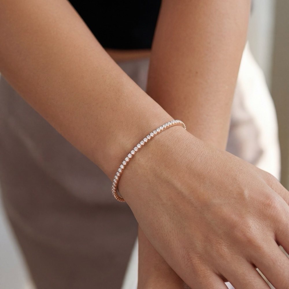 Elastisches Zugarmband ohne Verschluss mit fein weißen Diamanten. Mit seiner exzellenten Verarbeitung und technisch ausgereift, ist es spielend leicht und sicher in der Handhabung. Aus edlem Roségold 750/- gefertigt.