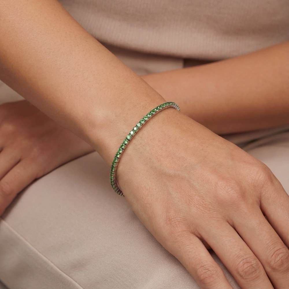 Elastisches Zugarmband ohne Verschluss mit leuchtend grünen Tsavoriten. Mit seiner exzellenten Verarbeitung und technisch ausgereift, ist es spielend leicht und sicher in der Handhabung. Aus edlem Weißgold 750/- gefertigt.