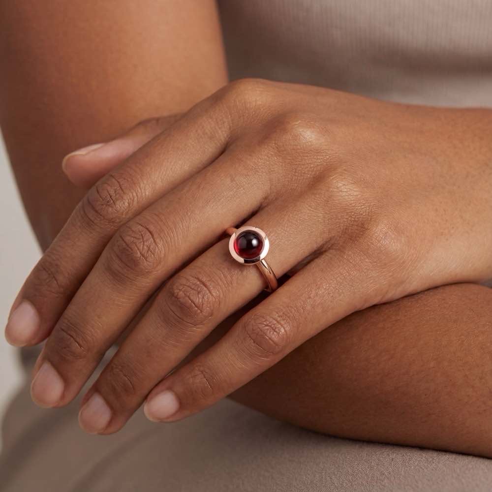 Dieser zurückhaltende „Sushi“ Ring aus 18-karätigem Roségold ist mit einem rotbraunen Hessonit verziert. Ein echter Blickfang!