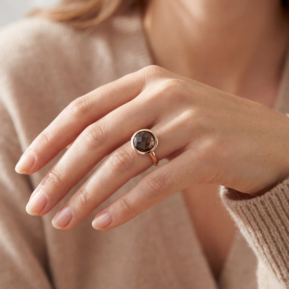 Eleganter Bron Sushi Ring aus 18‑karätigem Roségold mit einem warm schimmernden, facettierten braunen Saphir. Der 12‑mm‑Edelstein im charakteristischen Sushi‑Design strahlt natürliche Tiefe und eine feine, stilvolle Ausstrahlung aus – ein moderner Farbsteinring voller Persönlichkeit und Understatement.