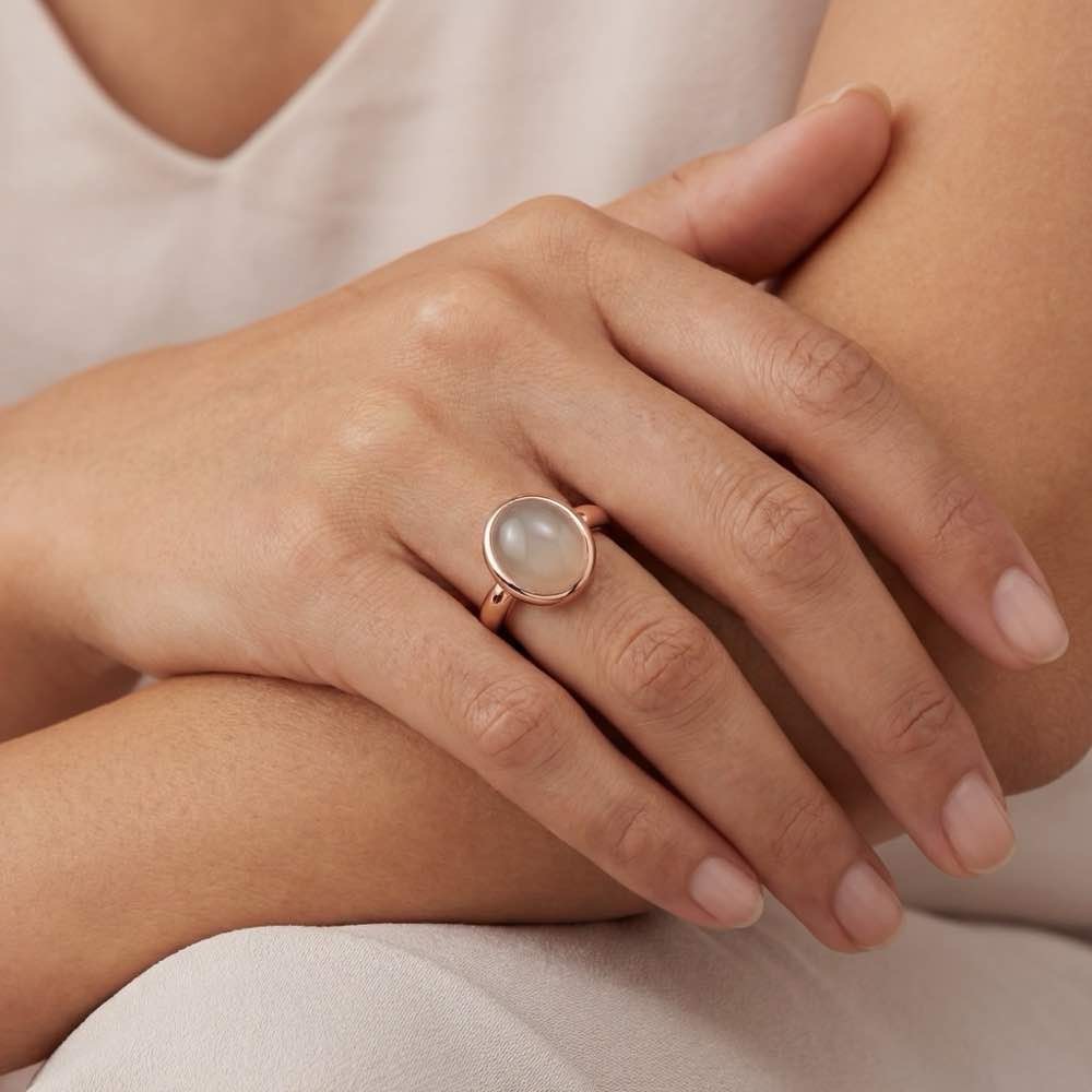 Ring Sushi aus der Kollektion City Garden. Subtiler Pinkie-Ring mit Mondstein im Cabochon-Schliff. Einfache Linien, interessante Proportionen. Gefertigt aus Roségold 18 Karat.