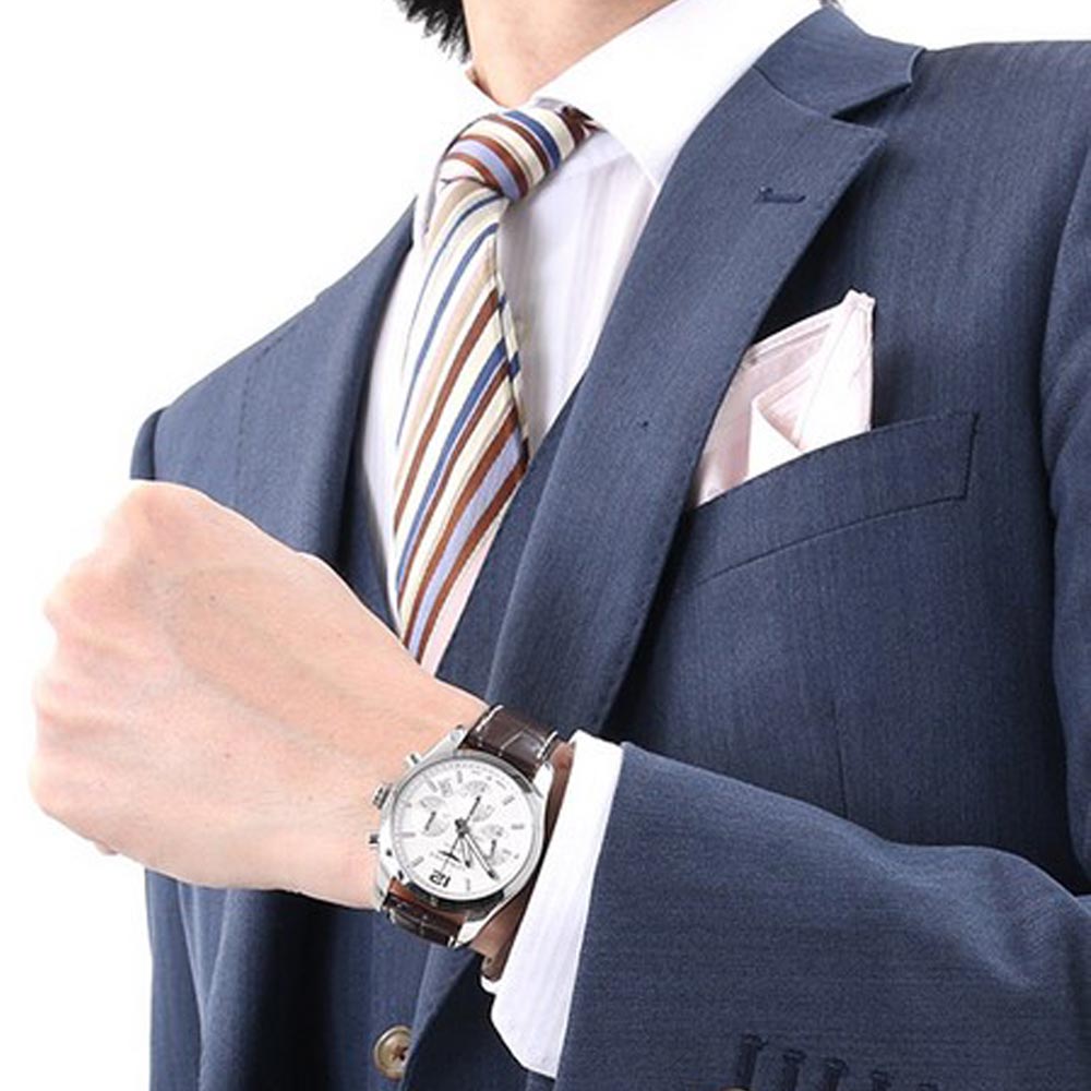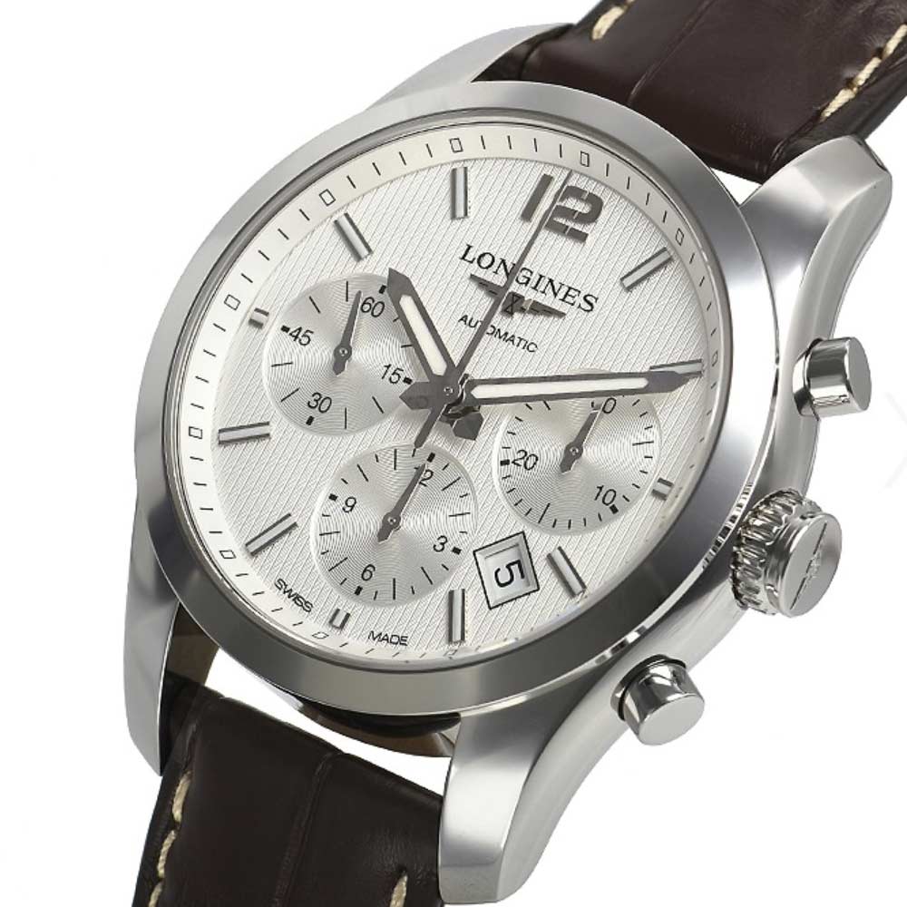 Longines Master Collection mit einem Durchmesser von 41 Millimetern und einem silberfarbenem Zifferblatt. Kratzfestes Saphirglas, mechanisches Uhrwerk mit Chronographenfunktion und automatischem Selbstaufzug. Gehäuse aus Edelstahl, braunes Alligator-Lederarmband mit Sicherheitsfaltschließe.