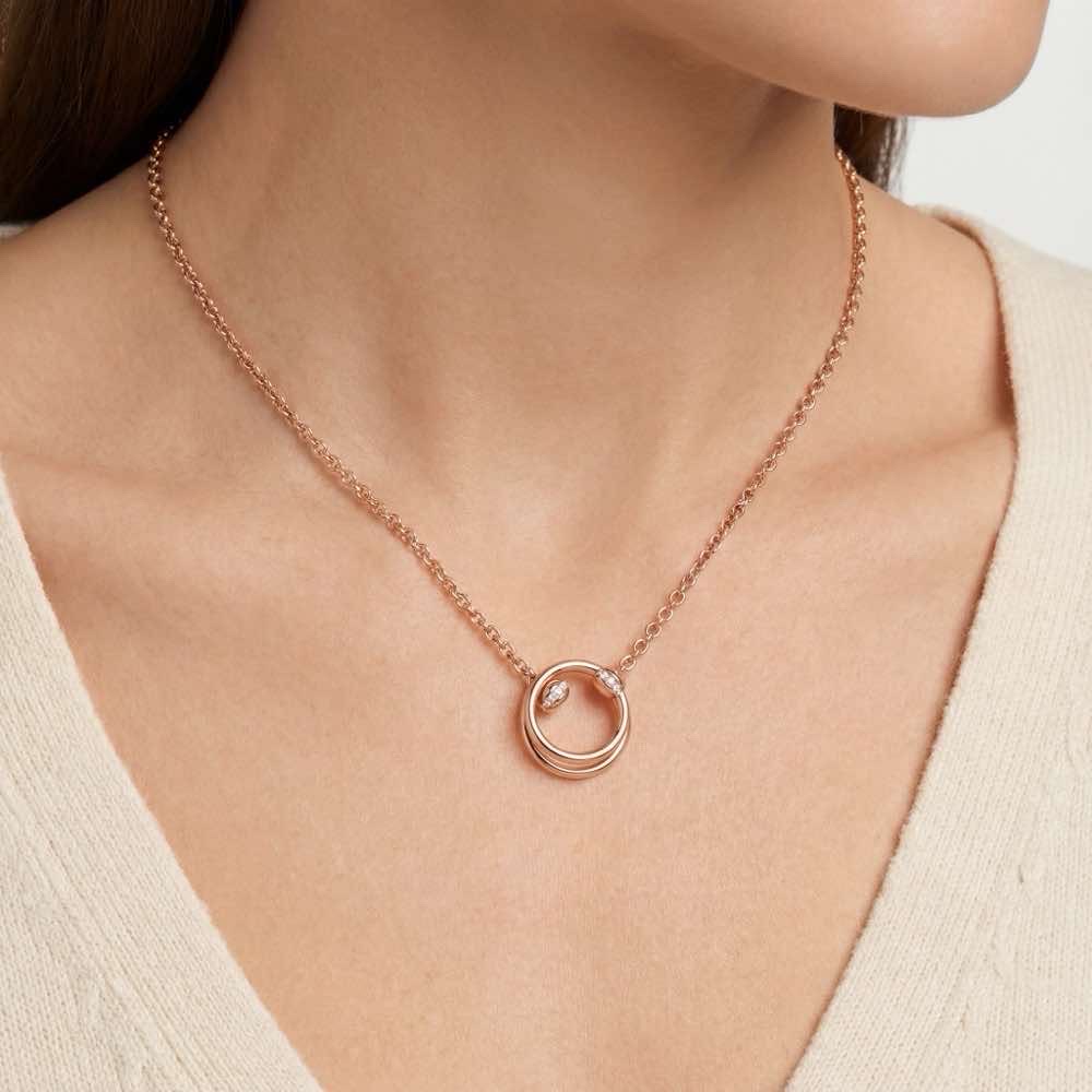 Der Anhänger glänzt mit Diamanten besetzten Goldgliedern - ein funkelndes Symbol für die Verbundenheit. Ein bewegliches Glied ermöglicht es der Kette, entlang der beiden Ringe zu gleiten: eine taktile Erinnerung an die Freiheit der Liebe!