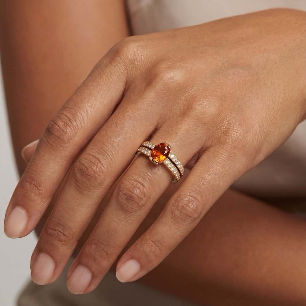 Ein faszinierender Ring mit einem leuchtend orangefarbenem Citrin und weißen Diamanten feinster Machart. Der Ring ist ein echter Allrounder, denn er passt sich dem täglichen Outfit genauso wie festlichen Anlässen an. In feiner Handarbeit in edlem Gelbgold 750/- gefertigt.
