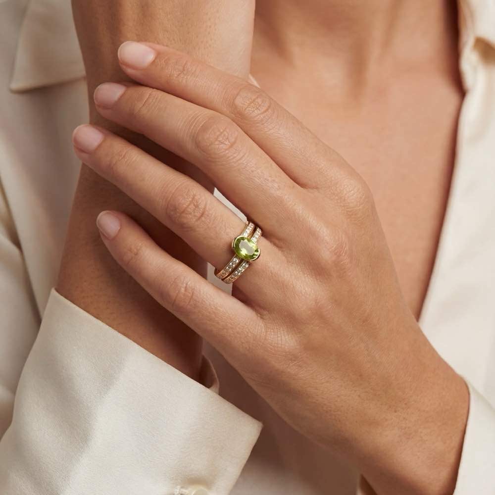 Außergewöhnlicher Ring mit einem leuchtend grünem Peridot und weißen Diamanten feinster Machart. Der Ring ist ein echter Allrounder, denn er passt sich dem täglichen Outfit genauso wie festlichen Anlässen an. In feiner Handarbeit in edlem Gelbgold 750/- gefertigt.
