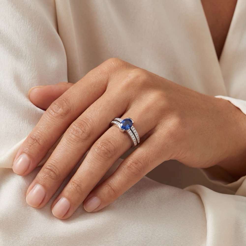 Ein faszinierender Ring mit einem leuchtend blauem Saphir und weißen Diamanten feinster Machart. Der Ring ist ein echter Allrounder, denn er passt sich dem täglichen Outfit genauso wie festlichen Anlässen an. In feiner Handarbeit in edlem Weißgold 750/- gefertigt.