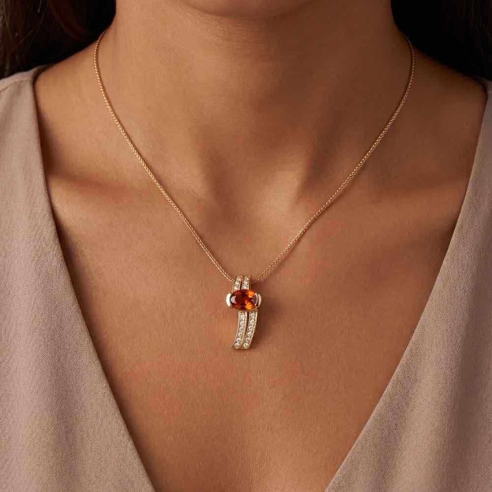 Außergewöhnlicher Halsschmuck mit einem strahlend orangenem Madeira-Citrin und weißen Diamanten feinster Machart. Der Halsschmuck ist ein echter Allrounder, denn er passt sich dem täglichen Outfit genauso wie festlichen Anlässen an. In feiner Handarbeit in edlem Gelbgold 750/- gefertigt.