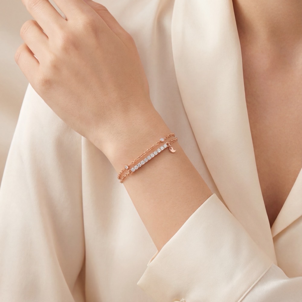 Lässiges zweireihiges Armband aus 18-karätigem Roségold mit weißen Diamanten. Das Armband lässt sich in verschiedenen Längen tragen und passt sich damit jedem Handgelenk an. Lässiger Luxus von Cervera!