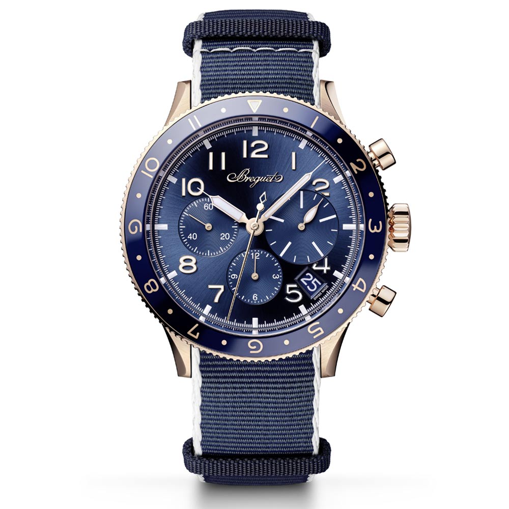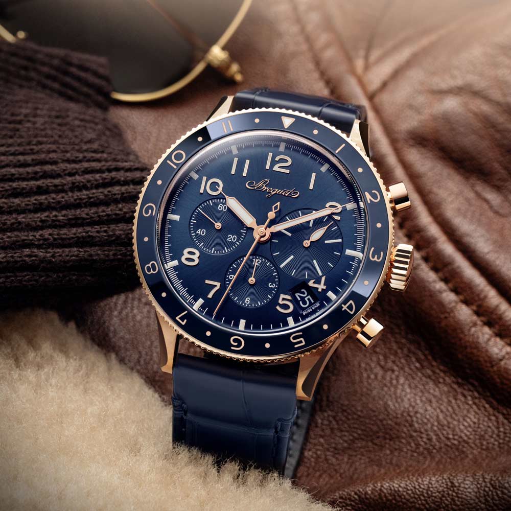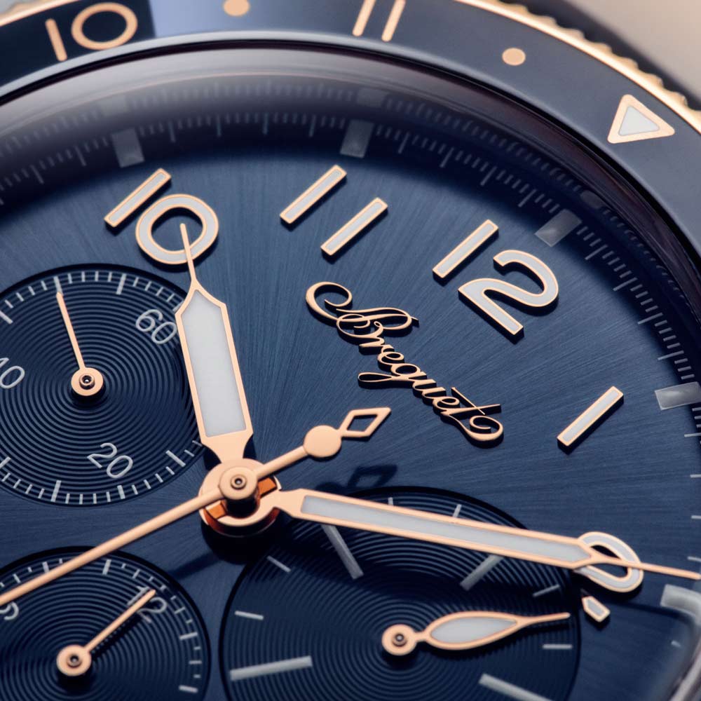 Mit der neuen Type XX 2067 in Roségold präsentiert Breguet erstmals eine Version der Modellreihe mit Goldgehäuse und beidseitig drehbarer Lünette – veredelt mit einem blauen Keramikeinsatz, der farblich auf das tiefblaue Zifferblatt abgestimmt ist. Dieses erinnert in seinem Farbspiel an den Himmel bei Sonnenuntergang und ist mit drei azurierten Zählern und applizierten, leuchtbeschichteten Goldziffern ausgestattet. Das Modell ist mit zwei Armbändern ausgestattet: einem aus Alligatorleder und einem sportlichen NATO-Band. Dank Schnellwechselsystem gelingt der Tausch in wenigen Sekunden. Im Inneren arbeitet das 2023 vorgestellte Kaliber 728 – ein vollständig in der Breguet-Manufaktur entwickeltes Automatikwerk mit Flyback-Funktion, vertikaler Kupplung und durchgehender Unruhbrücke für hohe Stoßsicherheit und Präzision. Diese neue zivile Ausführung vereint technische Finesse mit sportlich-eleganter Ästhetik und bringt moderne Materialien wie Keramik erstmals in die Type-XX-Familie.