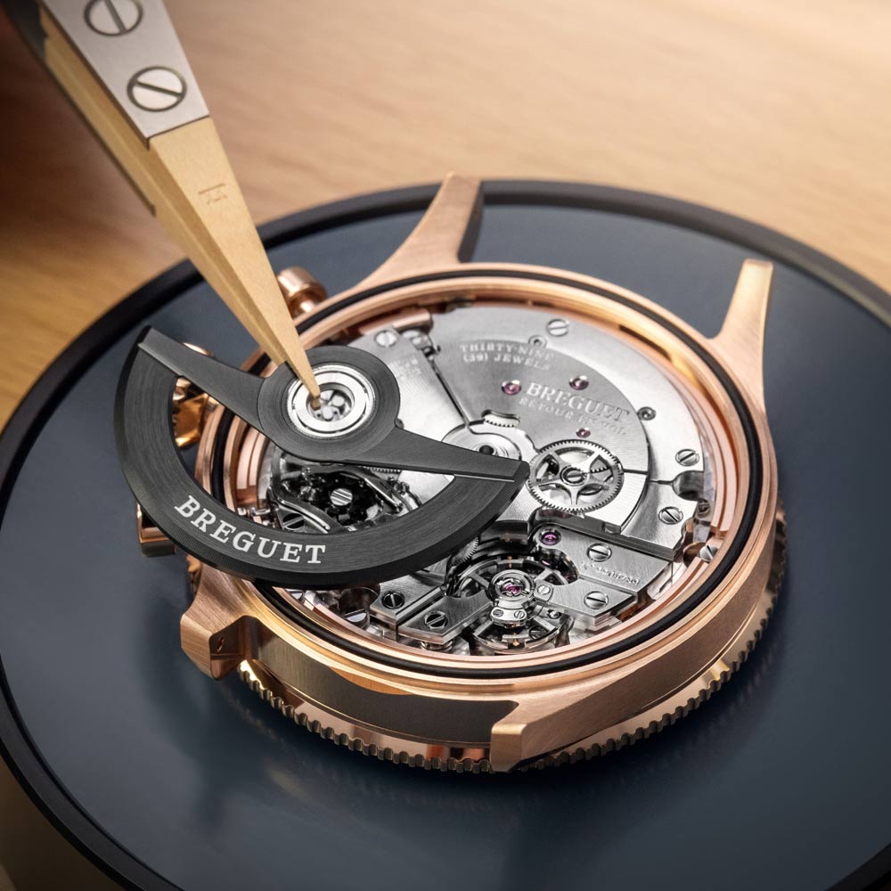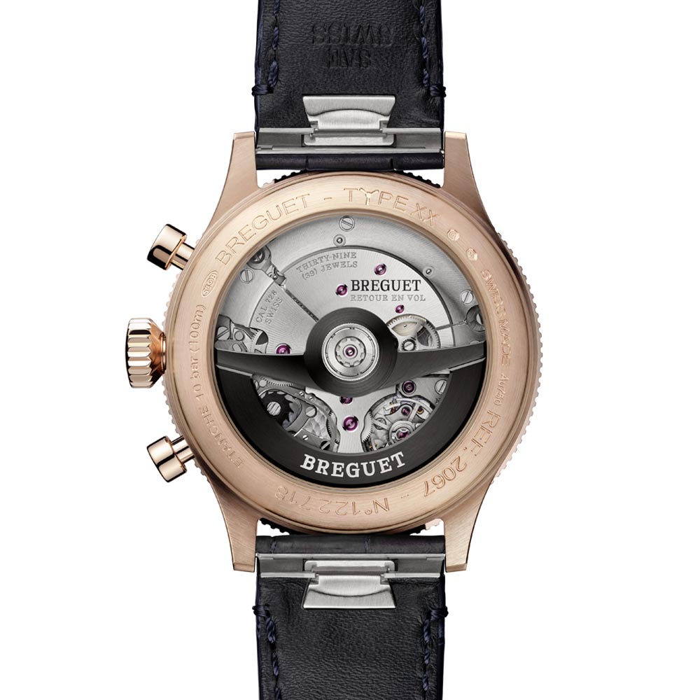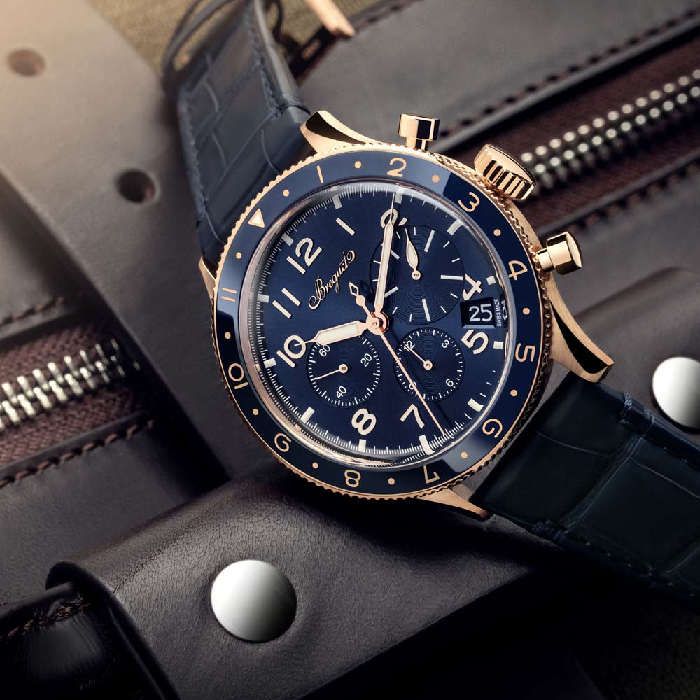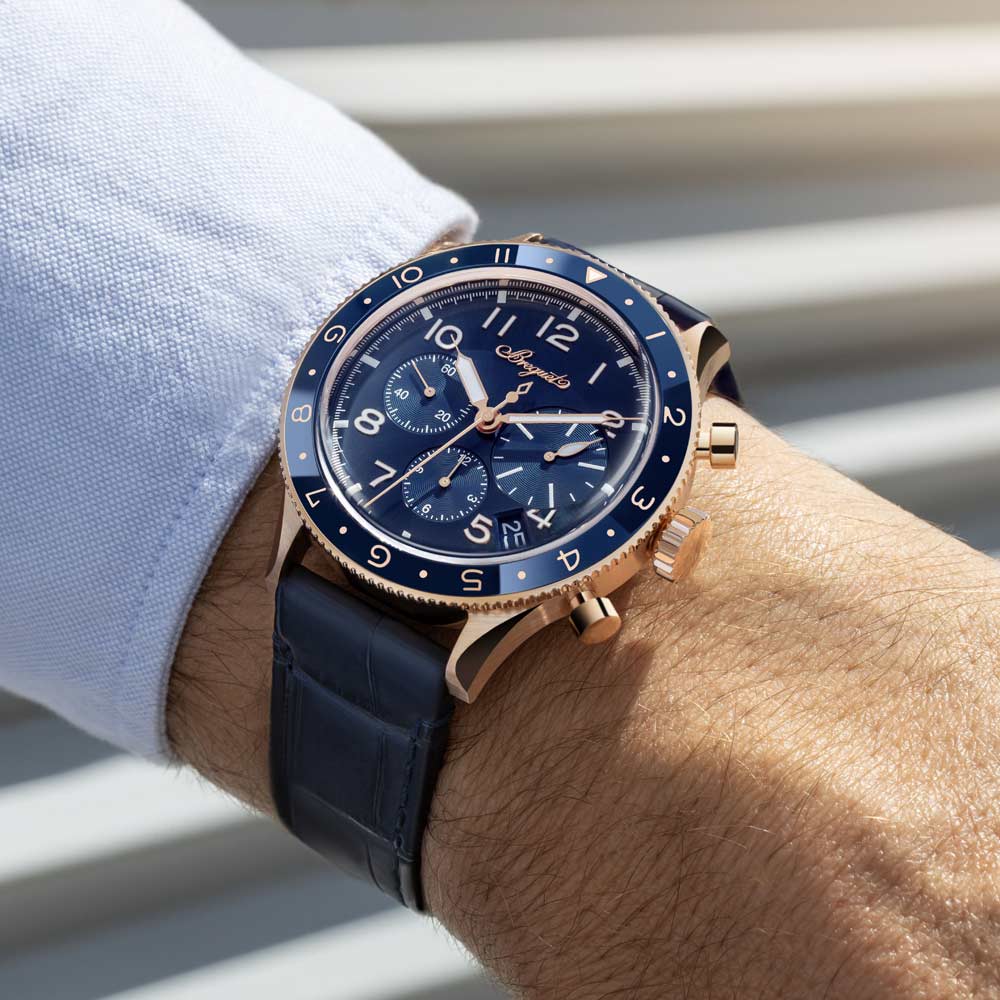 Mit der neuen Type XX 2067 in Roségold präsentiert Breguet erstmals eine Version der Modellreihe mit Goldgehäuse und beidseitig drehbarer Lünette – veredelt mit einem blauen Keramikeinsatz, der farblich auf das tiefblaue Zifferblatt abgestimmt ist. Dieses erinnert in seinem Farbspiel an den Himmel bei Sonnenuntergang und ist mit drei azurierten Zählern und applizierten, leuchtbeschichteten Goldziffern ausgestattet. Das Modell ist mit zwei Armbändern ausgestattet: einem aus Alligatorleder und einem sportlichen NATO-Band. Dank Schnellwechselsystem gelingt der Tausch in wenigen Sekunden. Im Inneren arbeitet das 2023 vorgestellte Kaliber 728 – ein vollständig in der Breguet-Manufaktur entwickeltes Automatikwerk mit Flyback-Funktion, vertikaler Kupplung und durchgehender Unruhbrücke für hohe Stoßsicherheit und Präzision. Diese neue zivile Ausführung vereint technische Finesse mit sportlich-eleganter Ästhetik und bringt moderne Materialien wie Keramik erstmals in die Type-XX-Familie.