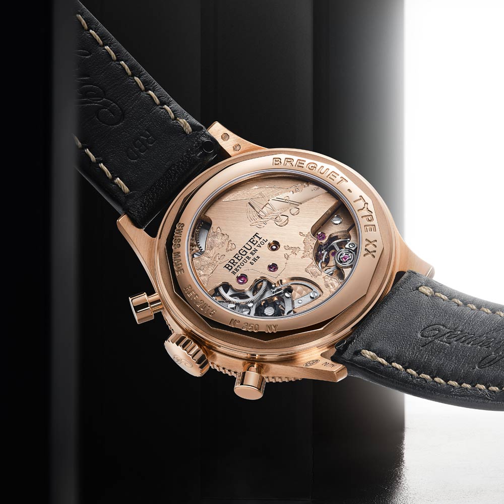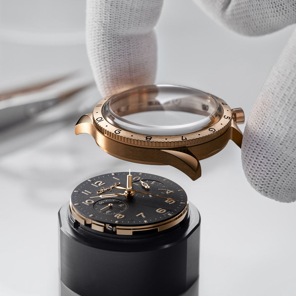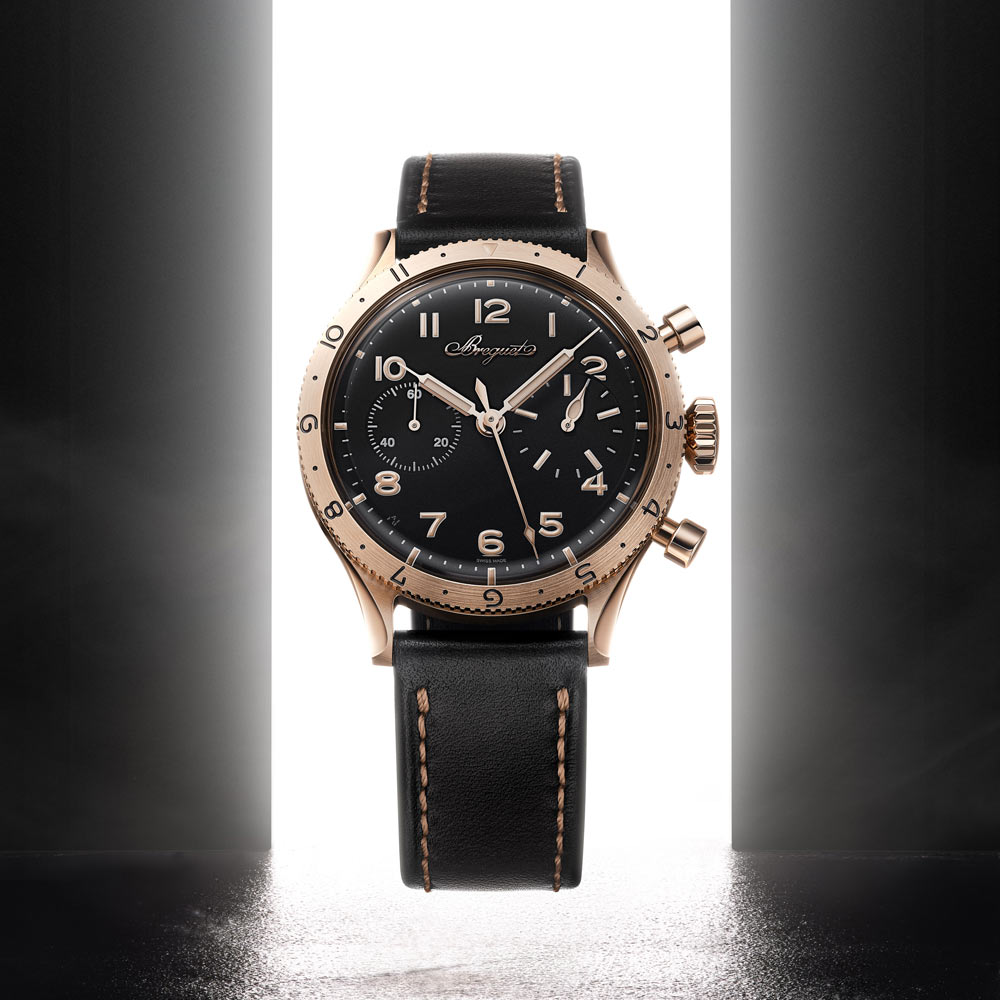 Diese Ausführung mit schwarz eloxiertem Aluminiumzifferblatt kombiniert ein satiniertes Gehäuse aus 18-karätigem Breguet-Gold (38,3 mm) mit beigefarbenen arabischen Ziffern, goldenen Leuchtzeigern und appliziertem Breguet-Schriftzug. Im Inneren arbeitet das Handaufzugskaliber 7279 mit 5 Hz und 60 Stunden Gangreserve sowie Flyback-Funktion. Abgerundet wird der Zeitmesser durch ein austauschbares Kalbslederband mit Dornschließe aus Breguet-Gold – eine moderne Hommage an die goldene Ära der Luftfahrt.