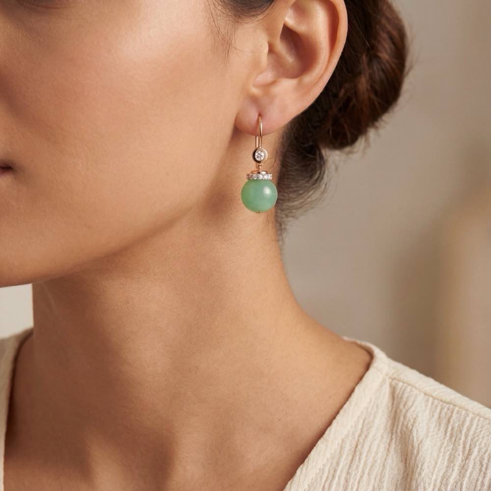 Stilvoller Ohrschmuck mit lindgrünen Chrysopras-Kugeln im Pretty Woman-Look. Die fein weißen Diamanten unterstützen die edle Anmutung der Chryssoprase. In hochwertigem 18-karätigem Roségold gearbeitet sind diese Ohrringe ein außergewöhnlicher eye-catcher.