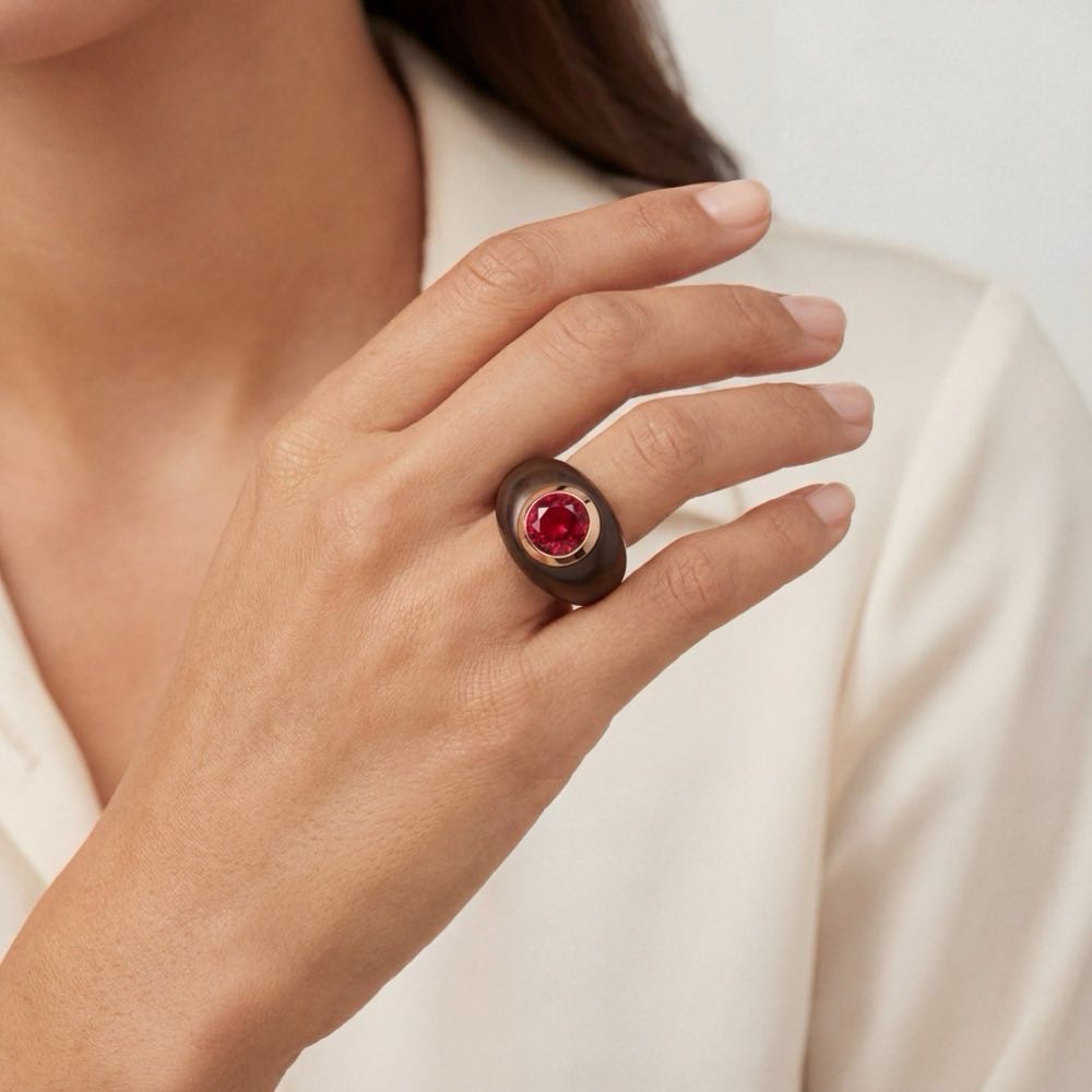 Charakterstarker Ring mit einem tiefroten Feueropal und einem Materialmix aus Bronze und warmem Roségold 18 Karat.