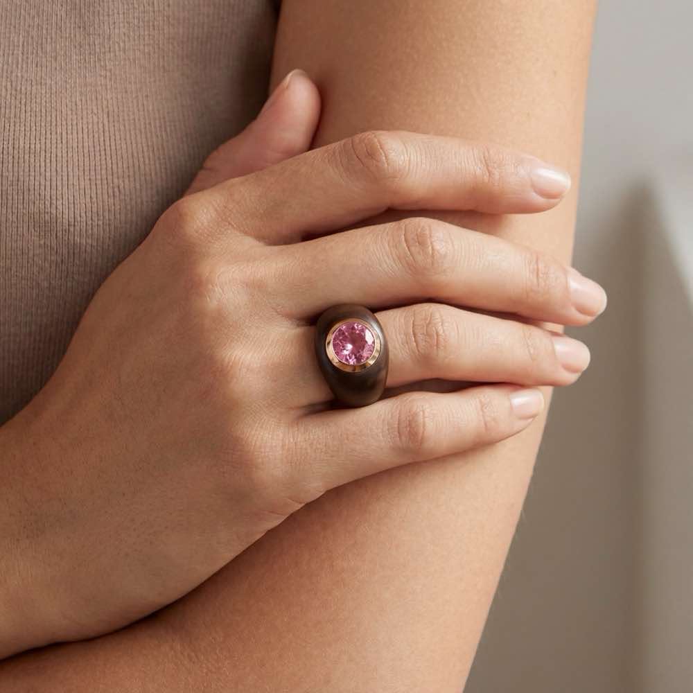 Charakterstarker Ring mit einem rosa Turmalin und einem Materialmix aus Bronze und warmem Roségold 18 Karat.
