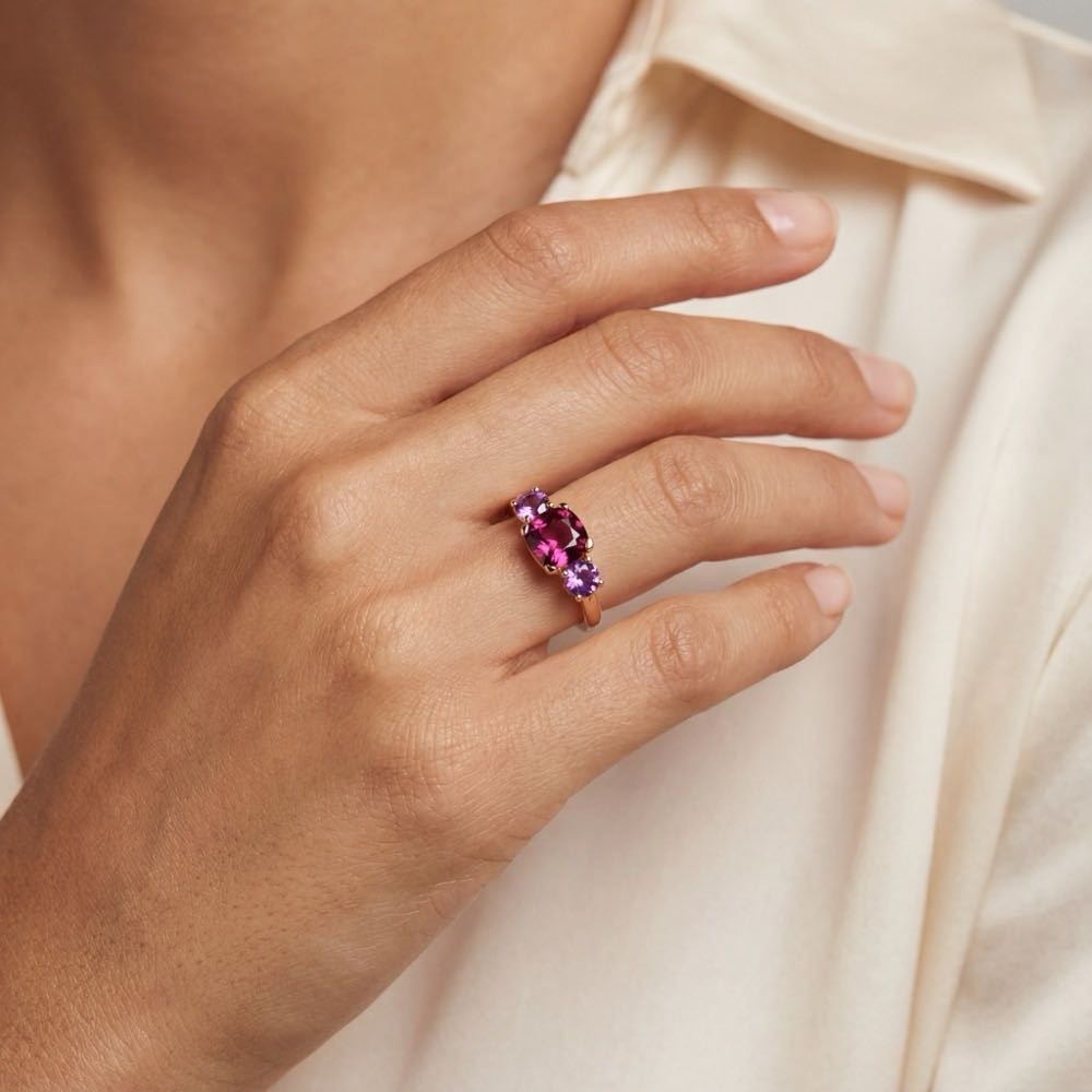 Farbenfroher Ring mit einem tiefroten Turmalin im Kissenschliff sowie zwei leuchtend violetten Amethysten. Das Design mit offenen Fassungen bringt die leuchtenden Farben außergewöhnlich schön zur Geltung und ist ein charmanter Glücksbringer für jeden Tag. Gearbeitet in feiner Handarbeit aus 18-karätigem Roségold.